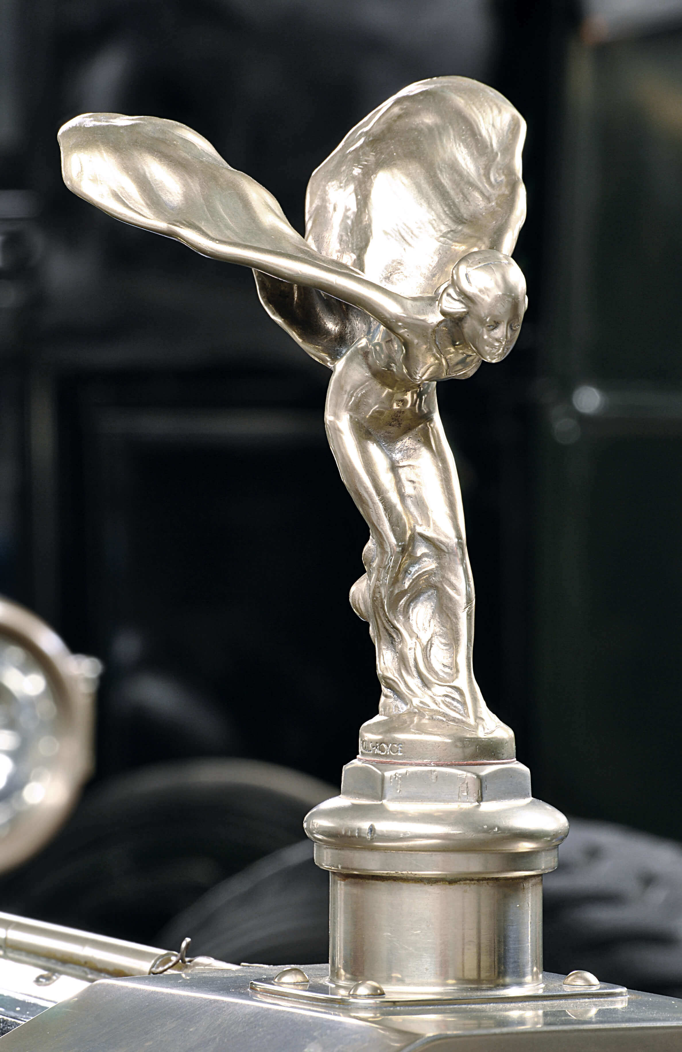 Elegant ladies with wind-blown hair were a common motif of hood ornaments. These flying ladies facing winds head-on found on Cadillacs and Rolls-Royces epitomized grace and beauty. Claude Johnson, managing director at Rolls-Royce in the early twentieth century, commissioned artist Charles Sykes to create an ornament for the brand after he had seen Sykes' creation "the Whisper" on Lord Montagu of Beaulieu's own Rolls-Royce. Johnson wanted an ornament that evoked the grace, sophistication, and quiet speed of the Rolls-Royce. The Spirit of Ecstasy, introduced in 1911, became a standard fitting in the early 1920s. "She has selected road travel as her supreme delight…she is expressing her keen enjoyment with her arms outstretched and her sight fixed upon the distance," said Johnson..jpg)