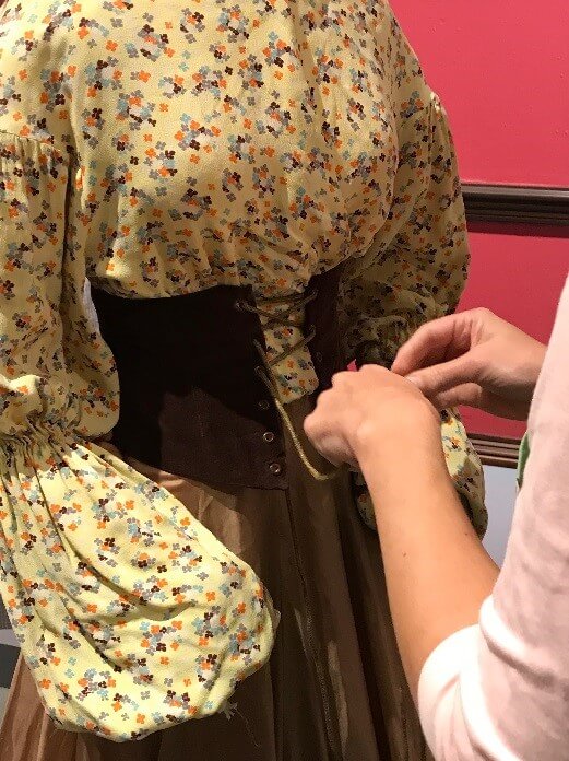 Sara Hume laces the corset on a costume from The Little Minister.
