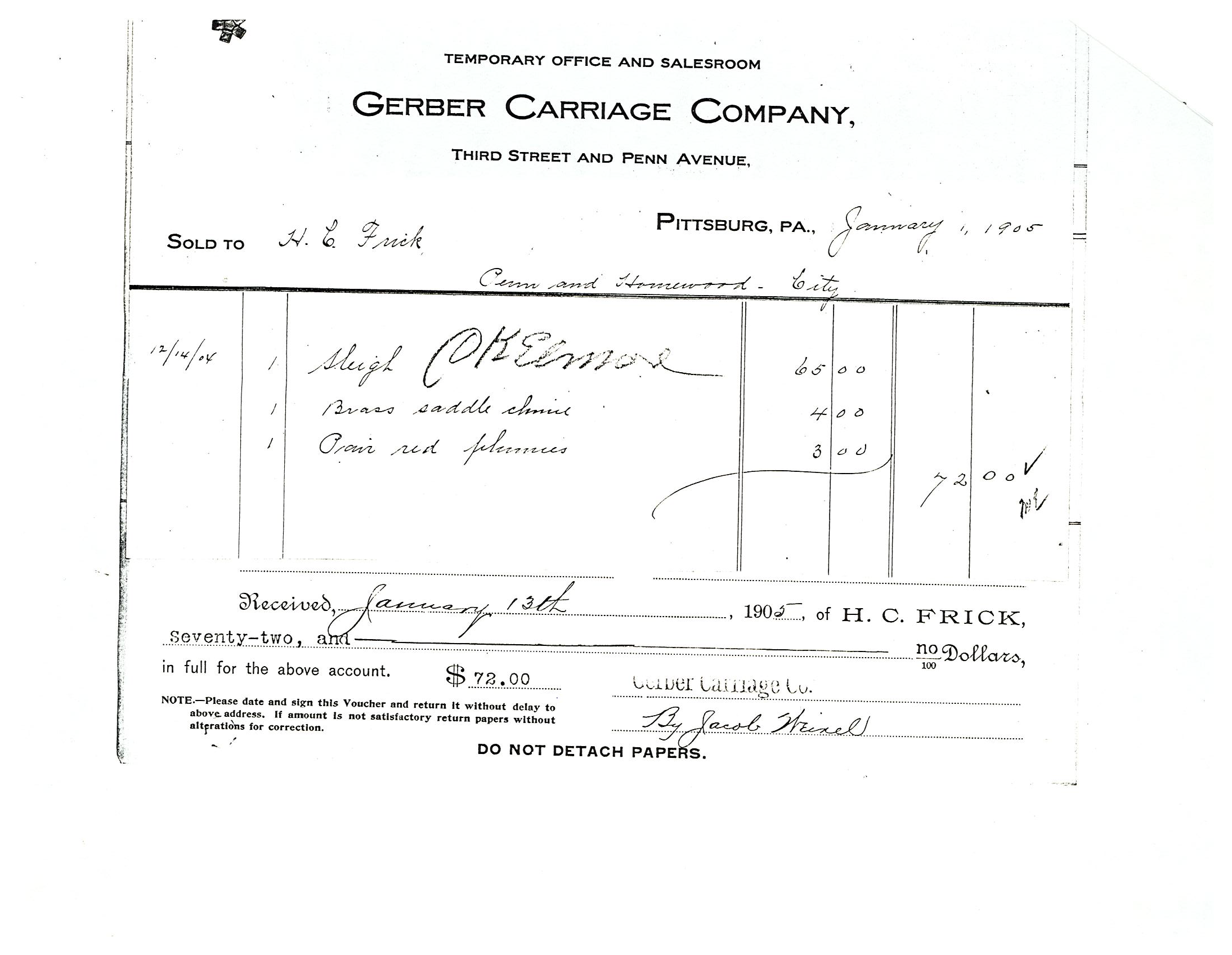 Voucher for the purchase of a sleigh from the Gerber Carriage Company in Pittsburgh, 1905. Image courtesy the Frick Collection and Frick Art Reference Library.