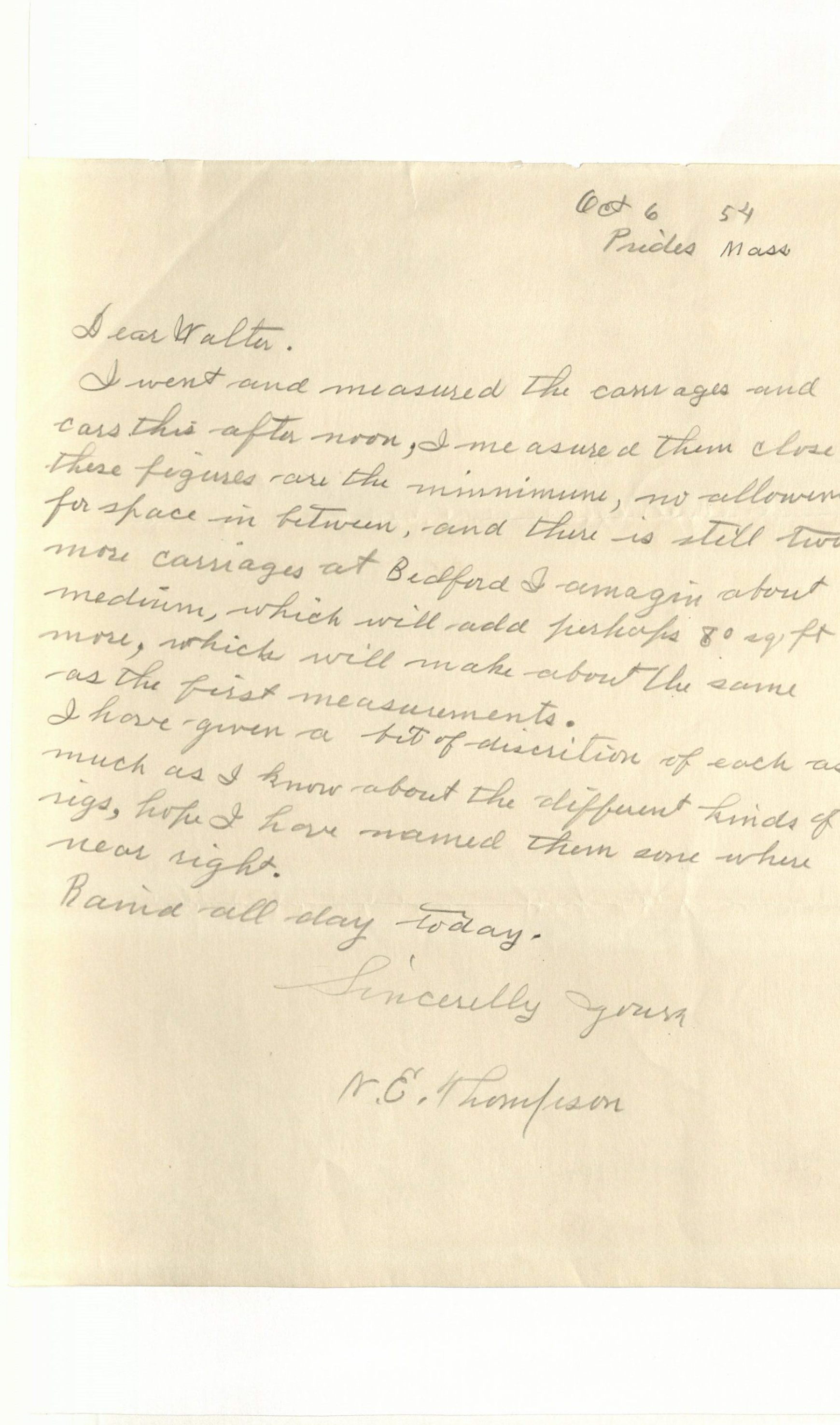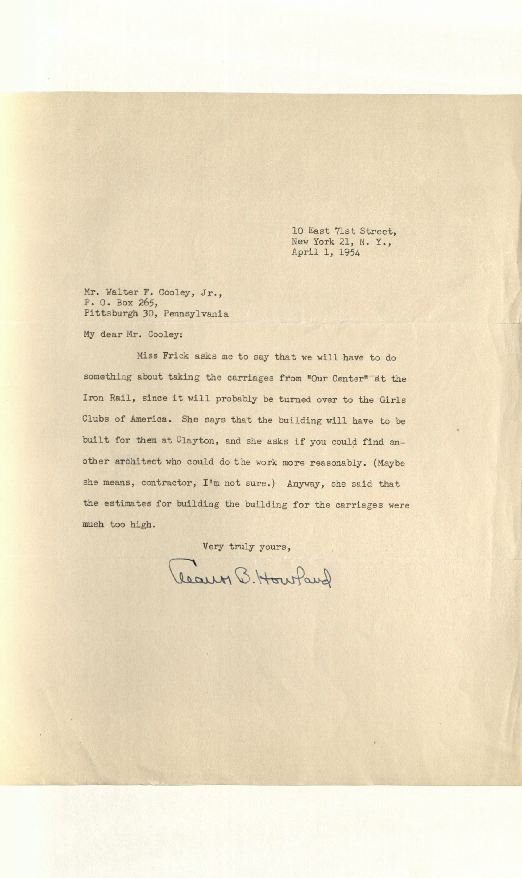 Letter written to Frick Foundation Trustee and Helen’s Business Manager Walter F. Cooley from Eleanor B. Howland, Helen’s secretary, regarding arrangements for the carriages located at the Iron Rail Vacation Home for Girls, April 1, 1954. Image courtesy the Frick Collection and Frick Art Reference Library.