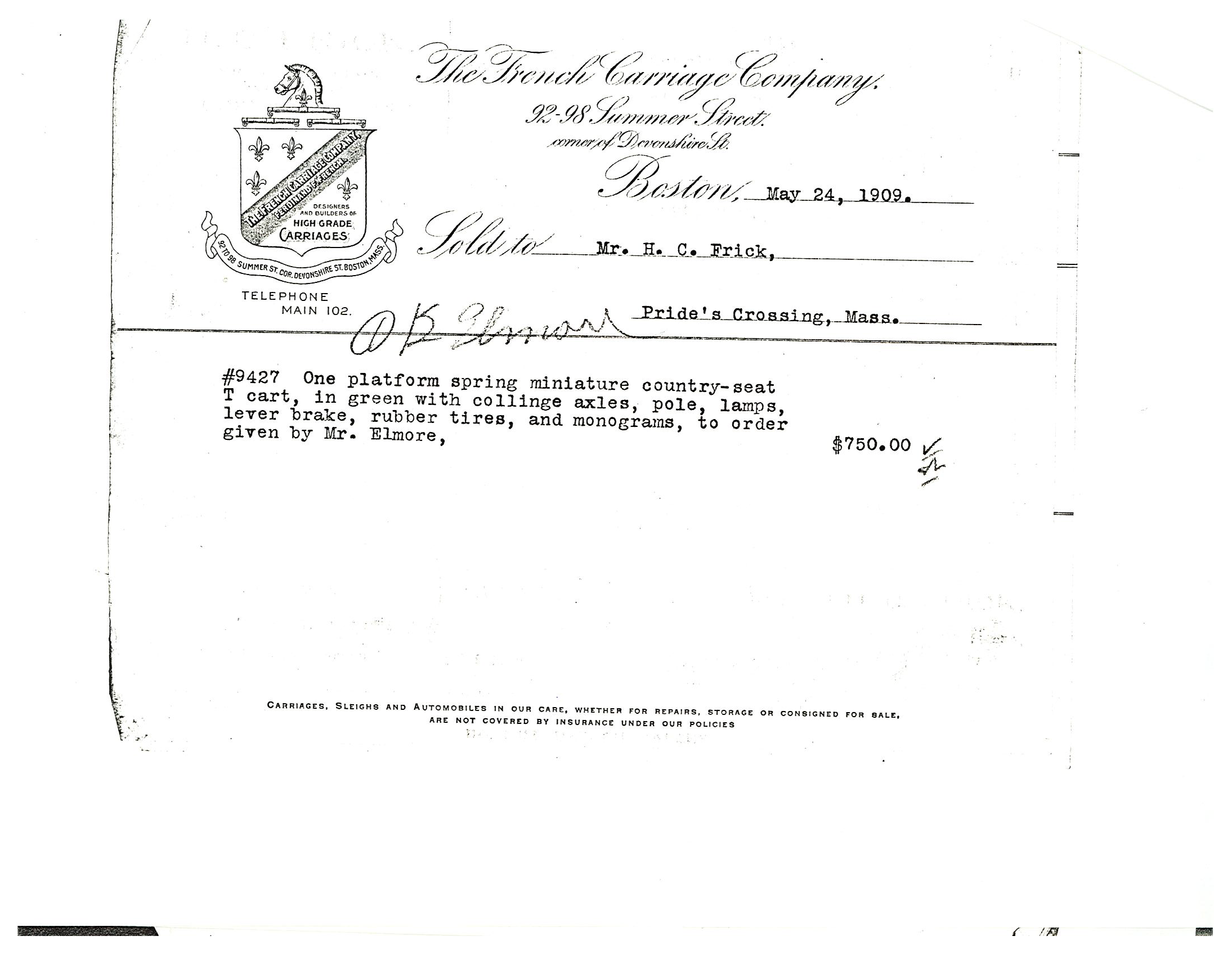 Voucher for the purchase of a miniature country-seat T-Cart from the French Carriage Company, 1909. Image courtesy the Frick Collection and Frick Art Reference Library.