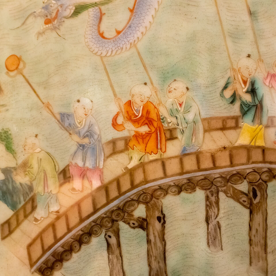 The majority of the objects in Frick’s collection were made during the reign of the Kangxi (1662–1722), Yongzheng (1723–1795), or Qianlong (1736–1795) emperors. Porcelains produced during this period are often considered the pinnacle of ceramic achievement in the Qing dynasty (1644–1912), showcasing technological advances and stylistic innovations. The examples on view represent the development of glaze technologies, including cobalt blue underglaze decoration, overglaze enamels, and a wide range of rich monochrome glazes. Decorative imagery contains examples of traditional Chinese symbolism, including dragons, flowers, fruits, and bats as well as figurative landscapes derived from literature, scroll paintings, woodblock prints, and religious subjects including Buddhism, Daoism, and Confucianism.