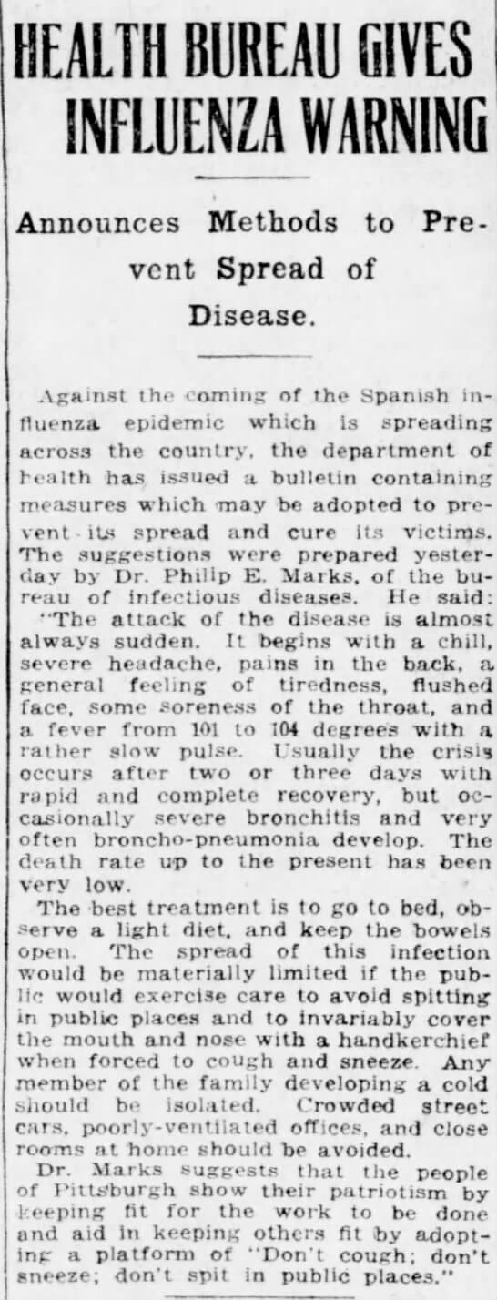 The local Board of Health issued a bulletin in mid-September 1918 with recommendations in advance of the flu's anticipated arrival in Pittsburgh which included such sage advice as "Don't cough; don't sneeze; don't spit in public places." But Board of Health officials also attempted to minimize the flu's reach by claiming that as the virus moved west, Pittsburghers would likely suffer from the less serious "Boston variety" and not the deadly "Philadelphia strain." (There was, of course, only one “strain” in 1918, and it was deadly everywhere).