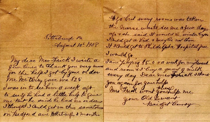 Bridget Conroy wrote again to Mrs. Frick two months later in August 1908: