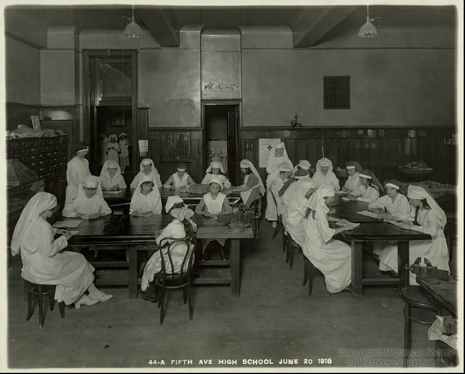 Young female Red Cross volunteers at Fifth Avenue High School in Pittsburgh rolling bandages for the war effort in June 1918. Red Cross assistance was invaluable just a few months later during the influenza outbreak.