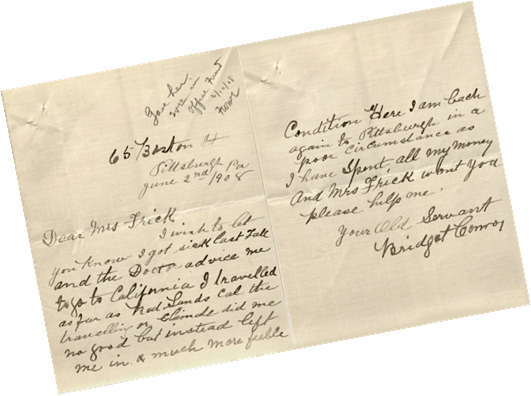 Records indicate that Bridget Conroy was admitted to the Pittsburgh Sanitarium in early August, shortly after writing her second letter to Adelaide Frick. Bridget died a month later, on 18 September 1908. Her nieces and nephews honored her final resting place at Pittsburgh’s Calvary Catholic Cemetery with a fine grave marker. It is not known whether her estate allowed for the additional expenditure of $40 as her will requested “for having Masses said for repose of my soul.”