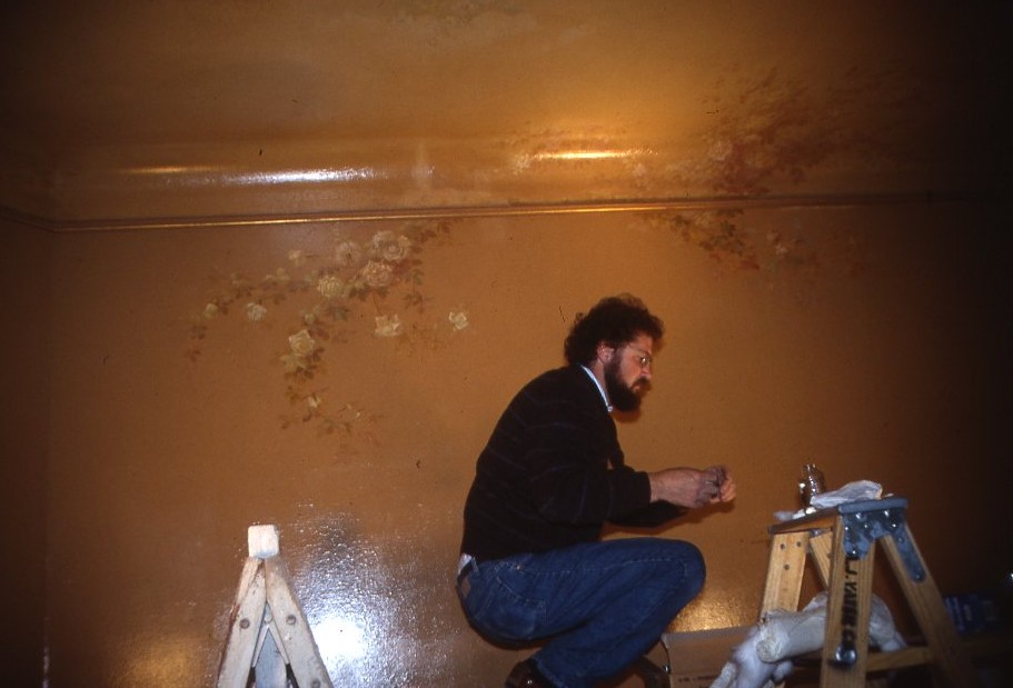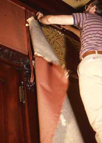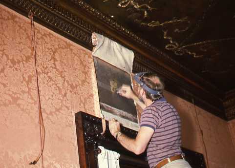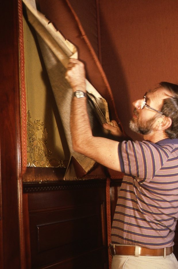 Conservator Robert Furhoff cleaning wall canvas in reception room in the late 1980s.