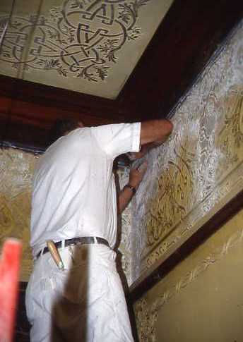 Craftsmen restoring plaster tracery in breakfast room, ca. 1984.