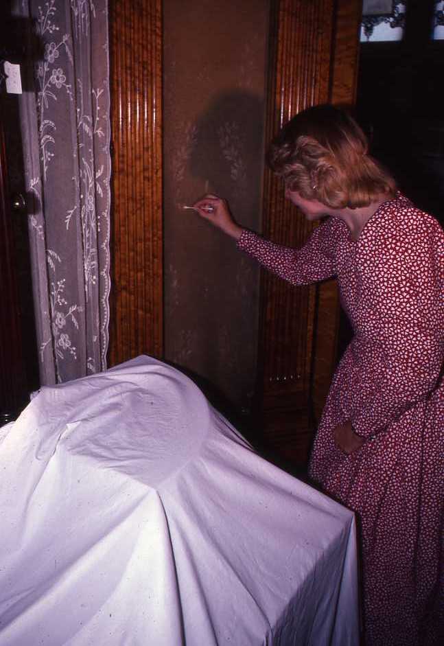 Conservator Christine Daulton examining the painted wall canvas in Henry Clay Frick’s bedroom in the 1980s.