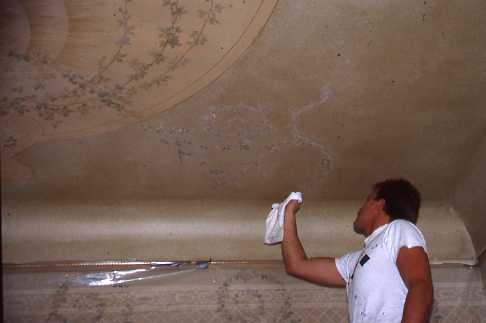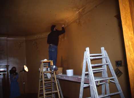 Painters cleaning ceiling of blue room in the 1980s.