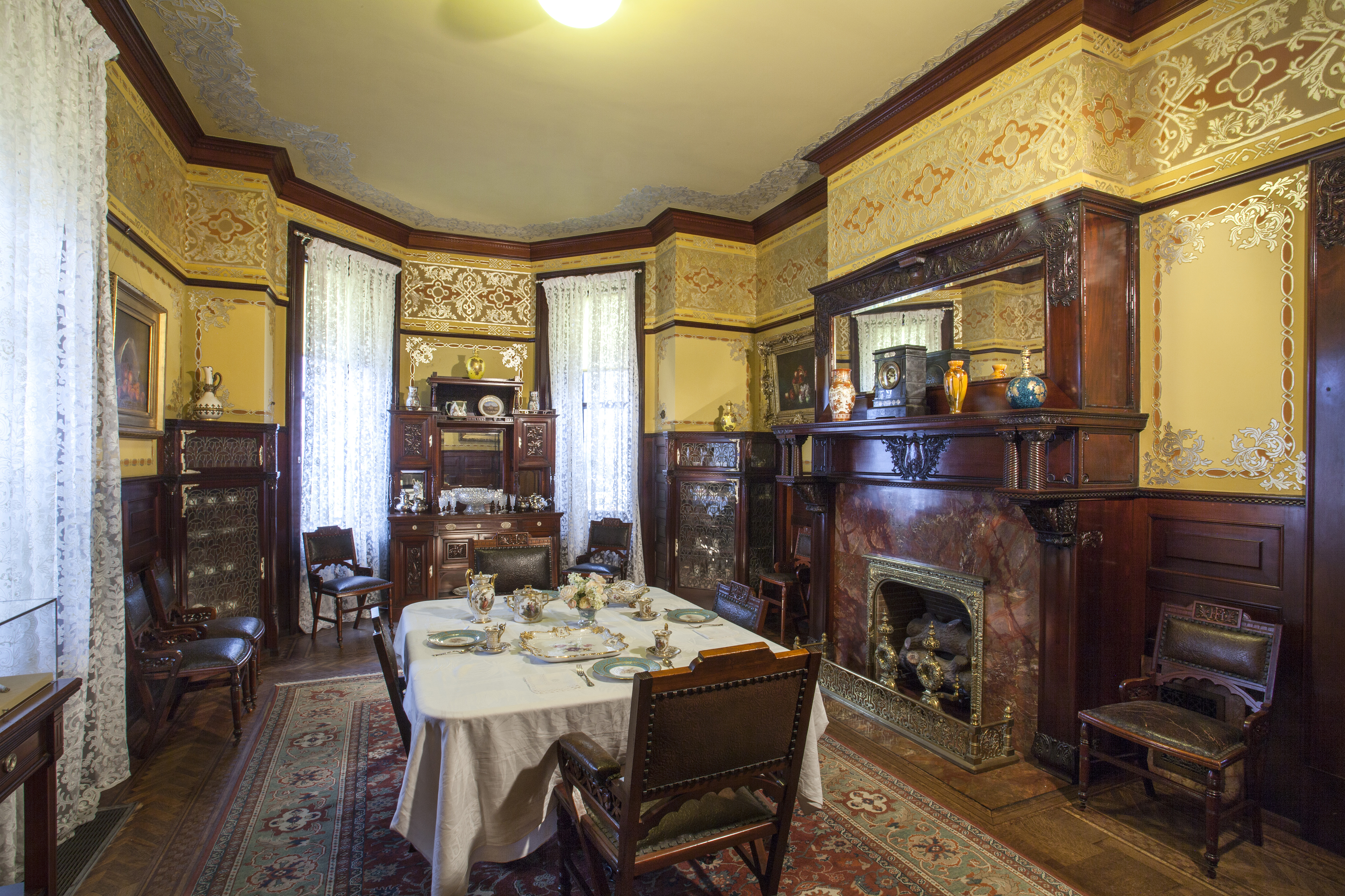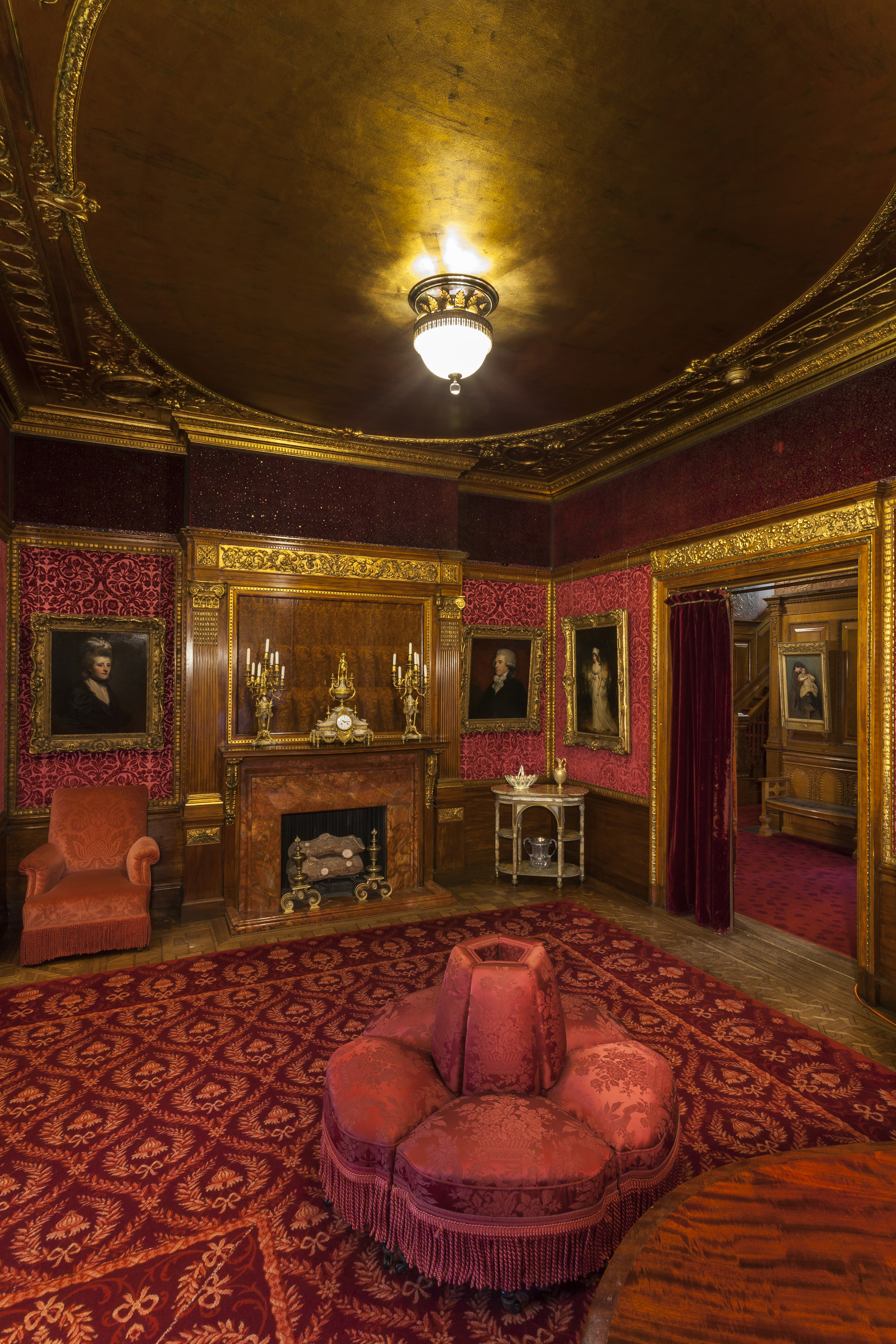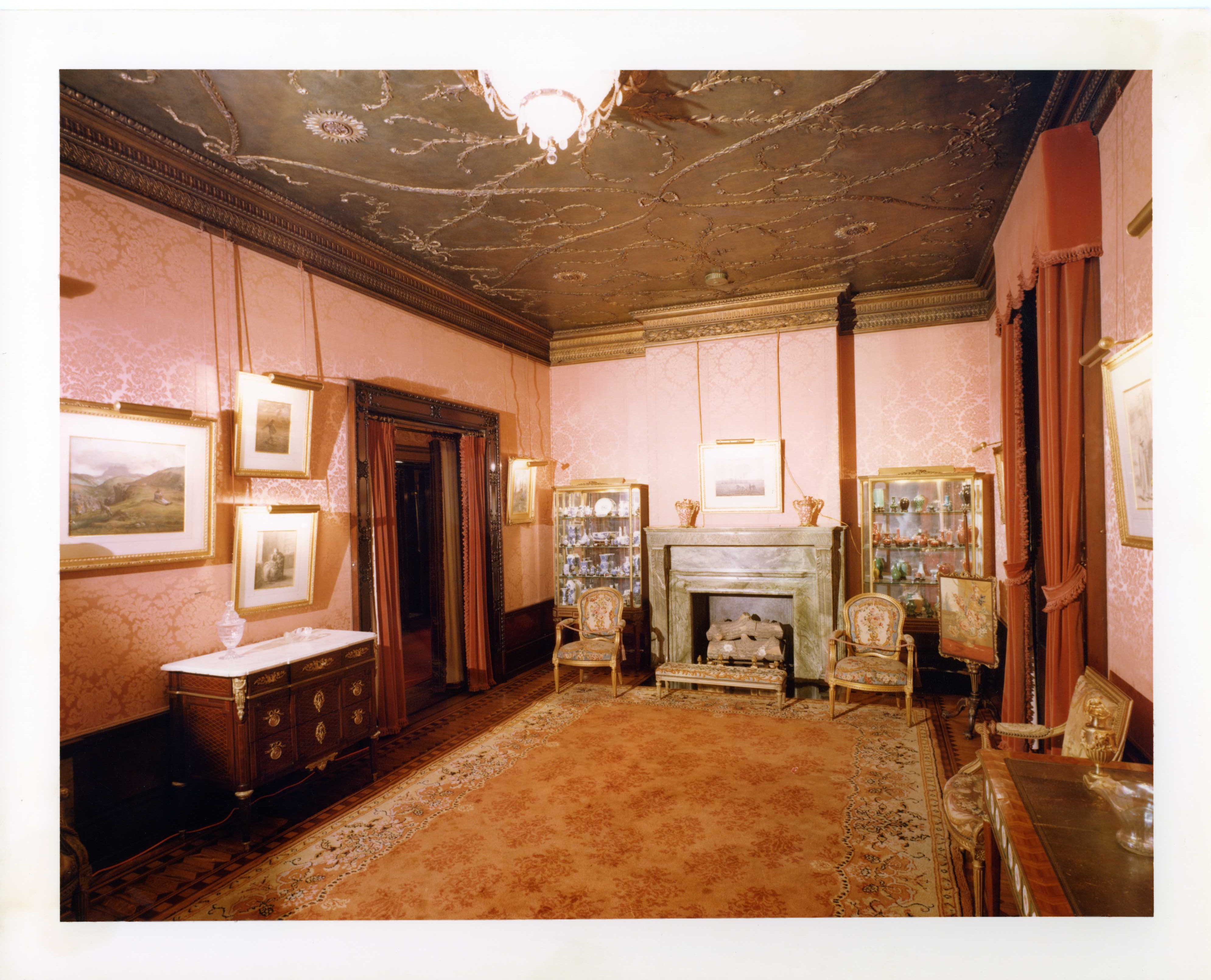 The reception room was particularly challenging as the most extensively altered of the public spaces on the first floor. While the discovery of the original 1890s frieze was exciting, it was complicated by the fact that none of the original furnishings from the 1890s survived, with the exception of the rug. In 1904, Cottier & Company extensively renovated the space. Decorators provided new fabric wall coverings, draperies, and a marble mantle, raised the wainscoting, refinished the woodwork, and—the most dramatic change—installed an elaborate ceiling and cornice with lacquered and gilded accents. Restoring the painted canvas frieze and interpreting the space to the 1890s would have necessitated deinstalling or even demolishing many of the later elements which were more complete in their entirety and in remarkably good condition. Ultimately, staff opted to document the frieze and leave it in place behind a newly created silk wall covering designed to match the one provided by Cottier in 1904.