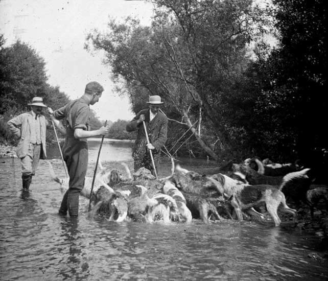 Otter hunting in river. “Wye Valley Otter Hounds on Monnow. Kill near Llancillo". August 1915. Courtesy of Shrewsbury Museum Service.