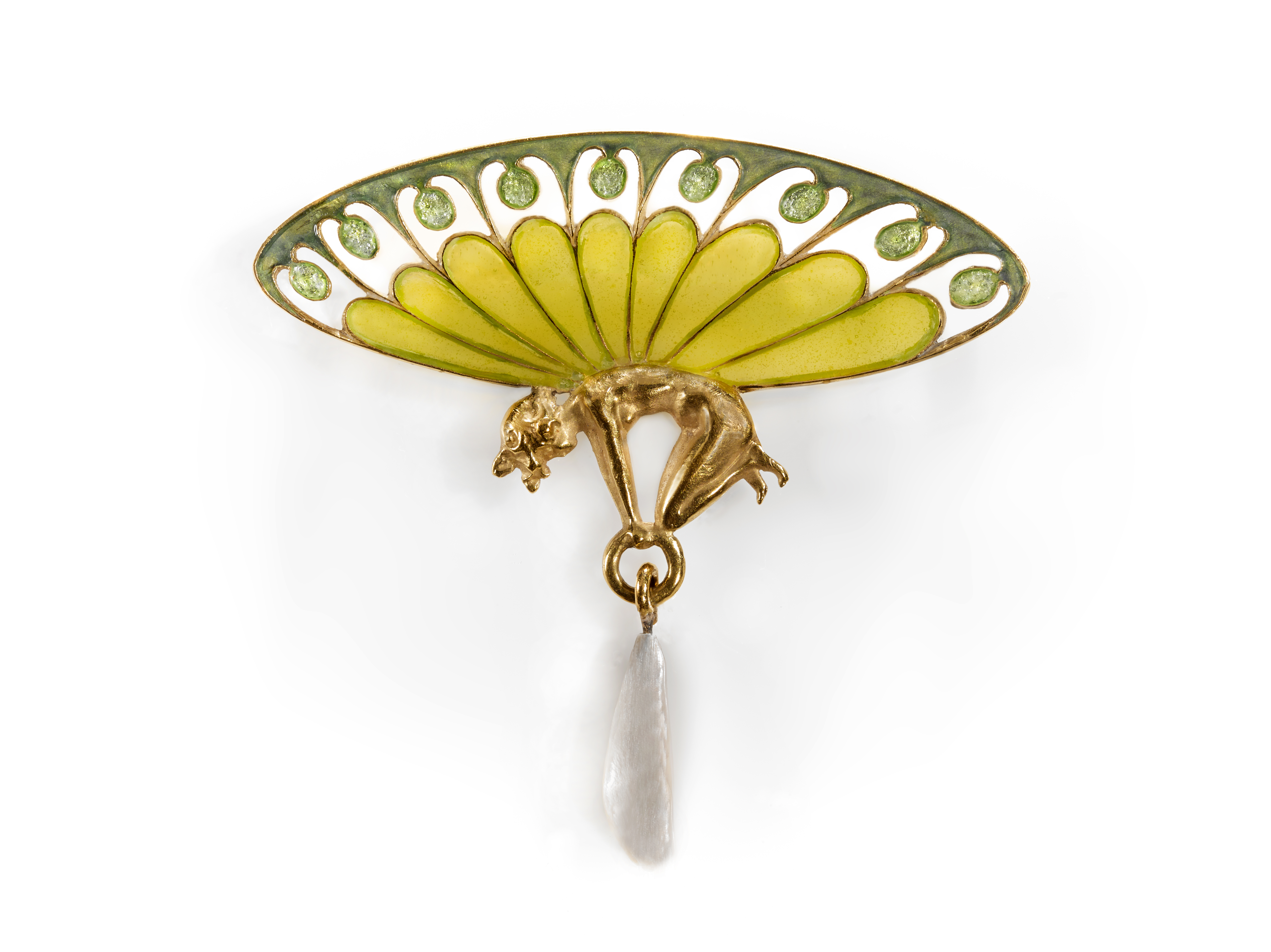 Gaston Eugène Omar Laffitte (French, active c. 1900) Brooch, c. 1900. Gold, enamel, diamond, pearl. Collection of Richard H. Driehaus.