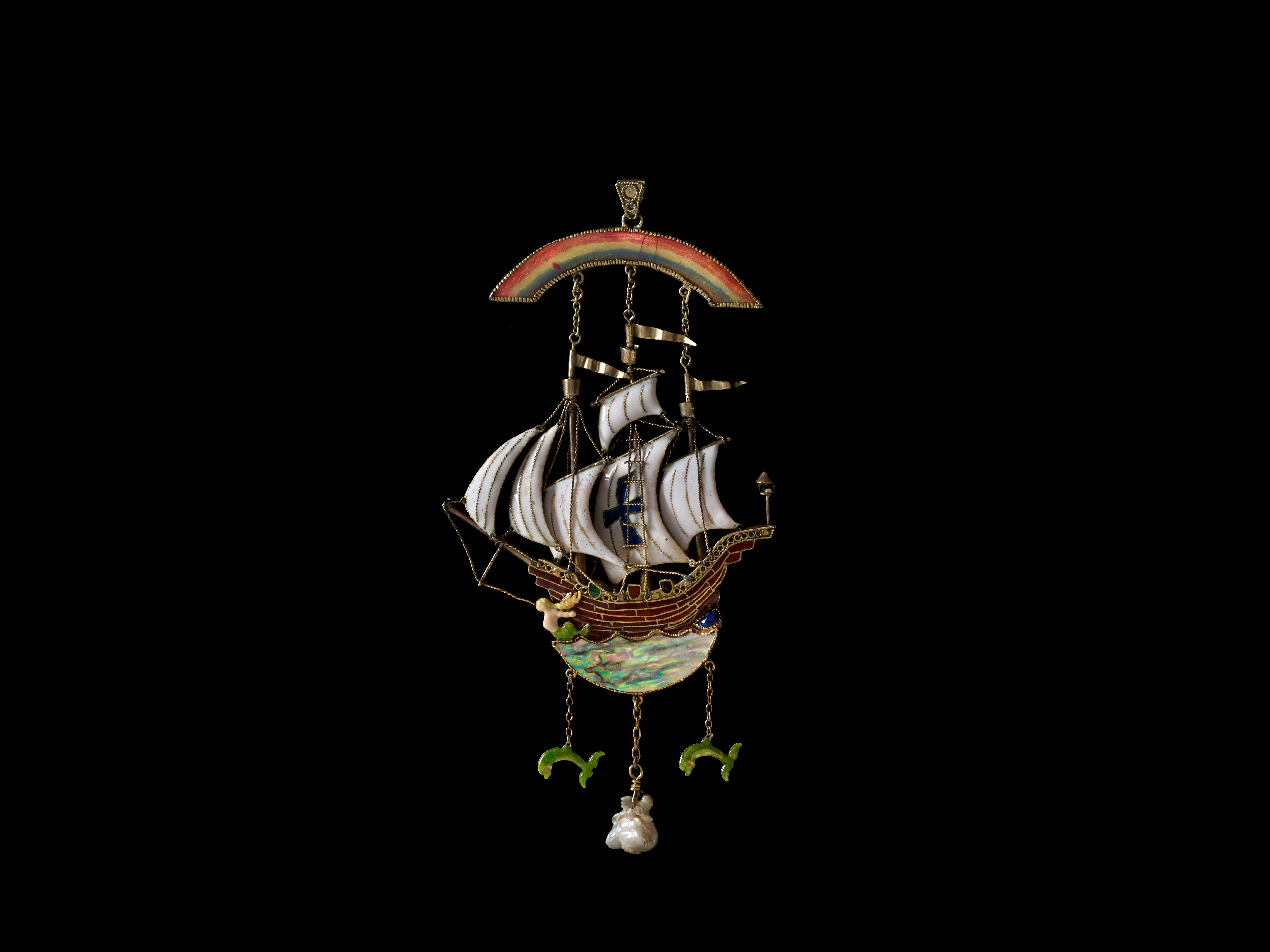 Henry Charles Barker, Galleon Pendant, c. 1915. Silver-gilt, copper alloy, enamel, abalone, baroque, pearl. Collection of Richard H. Driehaus. Photograph by John Faier, © 2014 The Richard H. Driehaus Museum.