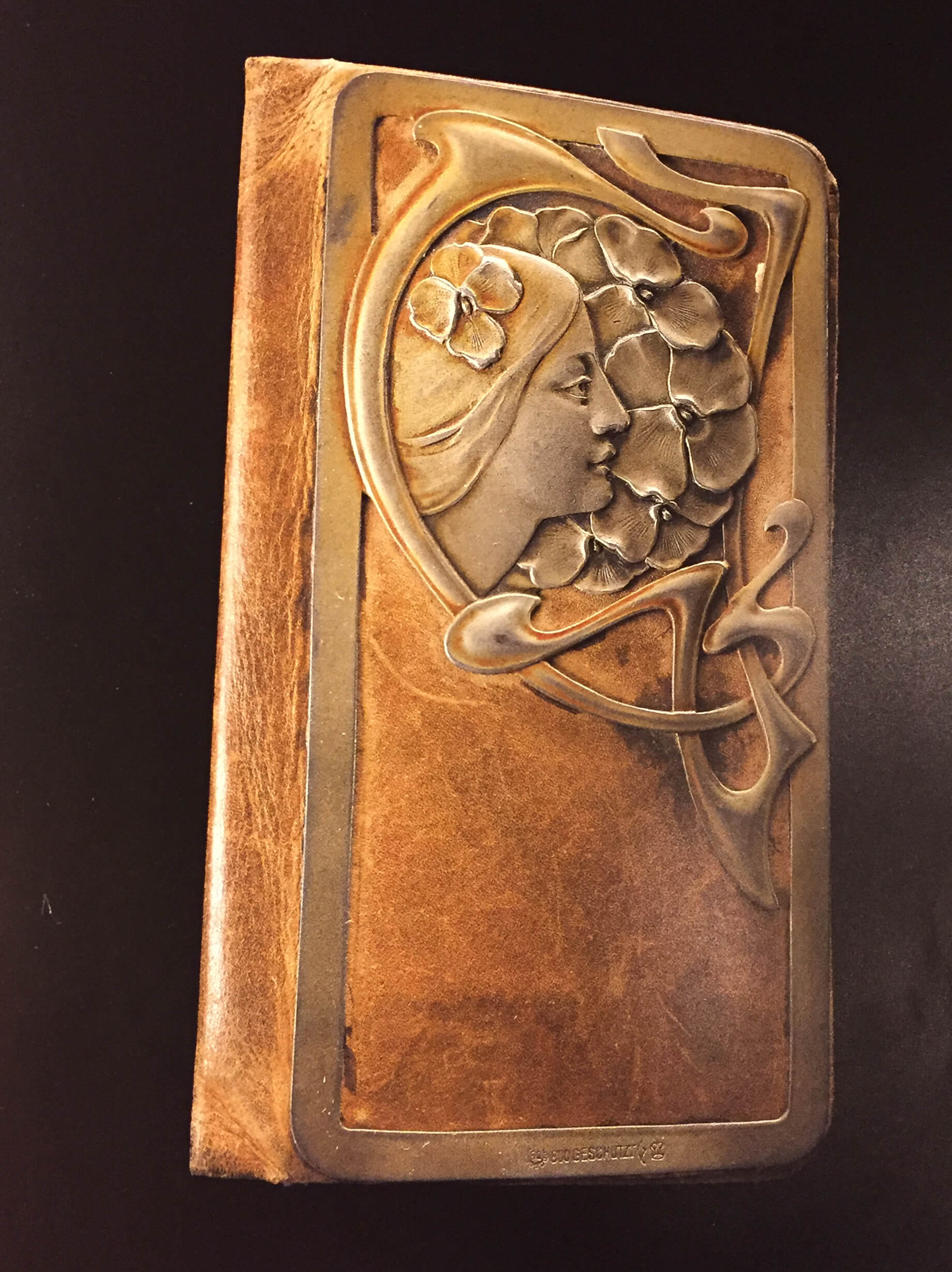 a brown deco wallet of metal and leather,