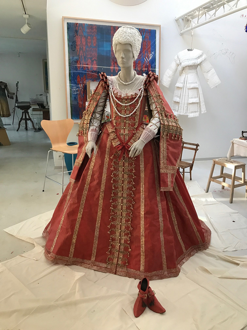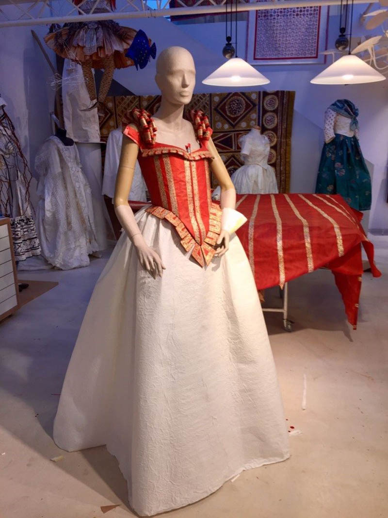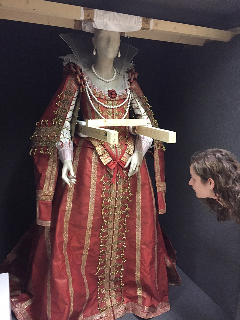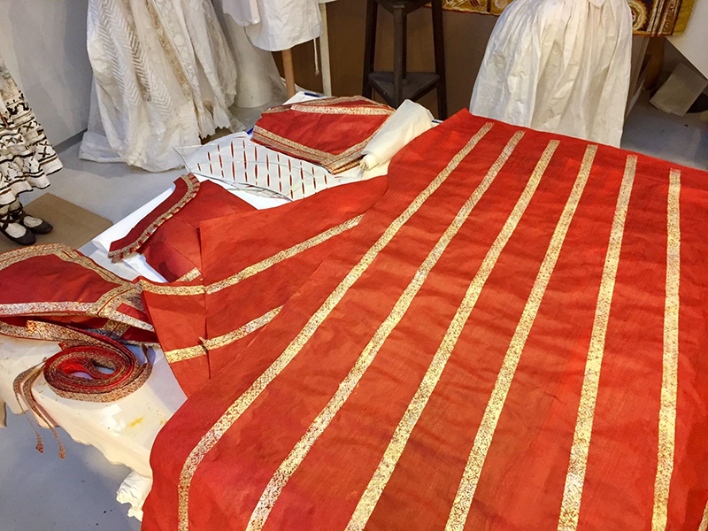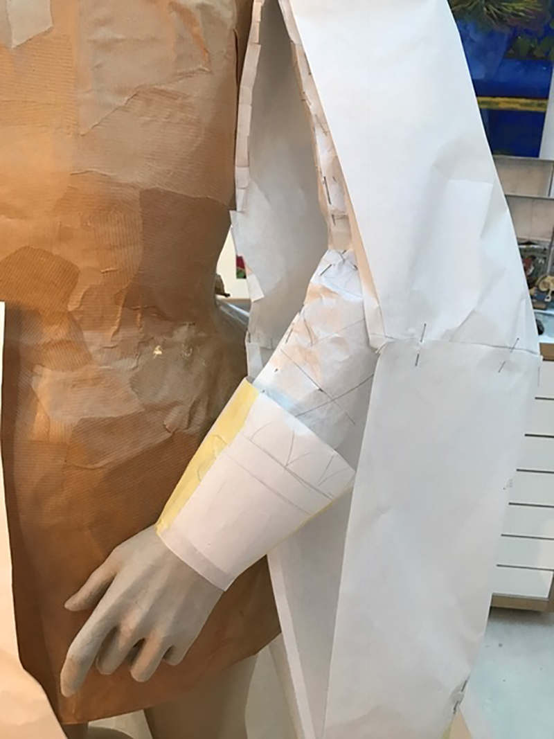 A close-up of the working prototype of the princess’s dress showing the slashed sleeve typical of early 17th-century fashion, and with sketching in place to indicate lace on the cuff.