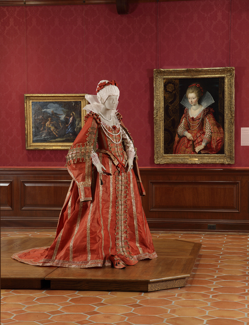 Rubens’ distinctive luminous skin tones, glowing colors, gorgeously rendered satin, pearls, and gold thread, make this portrait a tour de force of painting technique. Underneath the sumptuous finery is the recently married 16-year-old Princess of Condé, Charlotte Marguerite de Montmorency (1594–1650). As a young lady serving in the court of Marie de’ Medici and King Henri IV, Charlotte caught the King’s eye. According to historical anecdote, she was quickly married and dispatched to Brussels with her husband to escape the King’s unwelcome attentions. Rubens likely painted this portrait during her stay at the archducal court in Brussels. After the King’s assassination in 1610, Charlotte and her husband were able to return to France. The Princess’s costume reflects typical aristocratic fashion in the early 1600s, with a tight, fitted bodice, full skirt, lavish ornamentation, slashed sleeves, wide lace collar, and use of multiple fabrics and textures. Capturing the rich details and Baroque ornamentation on display in Rubens’ portrait, de Borchgrave and her team interpreted the variety of textures and qualities of the ribbons, pearls, laces, and silk satin of the sumptuous gown. De Borchgrave also emulated the Princess’s transparent starched linen collar shaped with tiny tucks and supported by a separate lace-covered rebato, or stiff flaring collar, the original of which would have been made of silk-covered wire.
