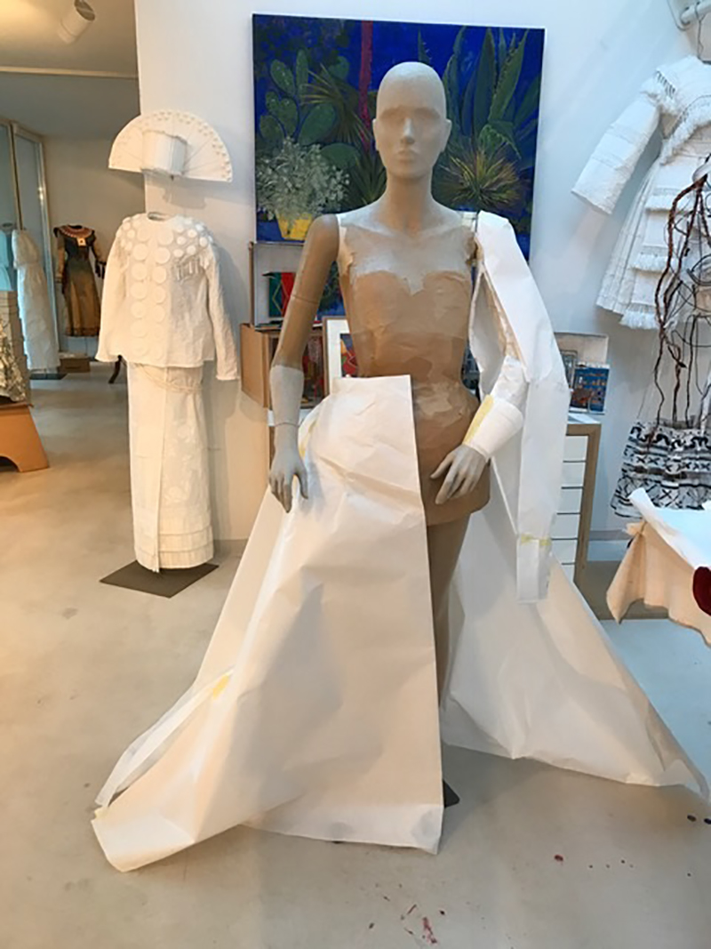 De Borchgrave’s studio is somewhat like a Renaissance studio with various members helping with specific tasks. During my visit to the studio, de Borchgrave referred to the plain white paper renditions of garments that were sprinkled around her studio as sketches, and indeed working with plain paper to create a prototype helps de Borchgrave and her team of assistants to determine the specific shape of the dress and create the pattern. Once the “sketch” is complete, studio assistants can help with specialized tasks—like painting the paper, cutting patterns, or creating the decorative borders or trim pieces. The Frick’s dress took about seven weeks to complete.