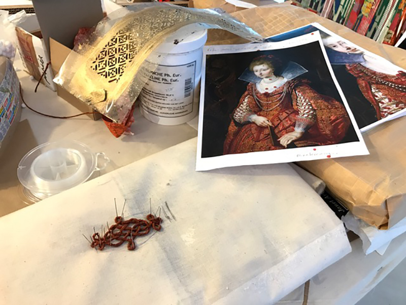 This photograph of the worktable shows reference photos of the Rubens portrait as well as one of the elaborate frog closures that adorn the princess’s gown. The closures are created from twisted paper that is pinned and glued into shape. Later they will be painted gold. In the background the stencil for the gold lace is visible.