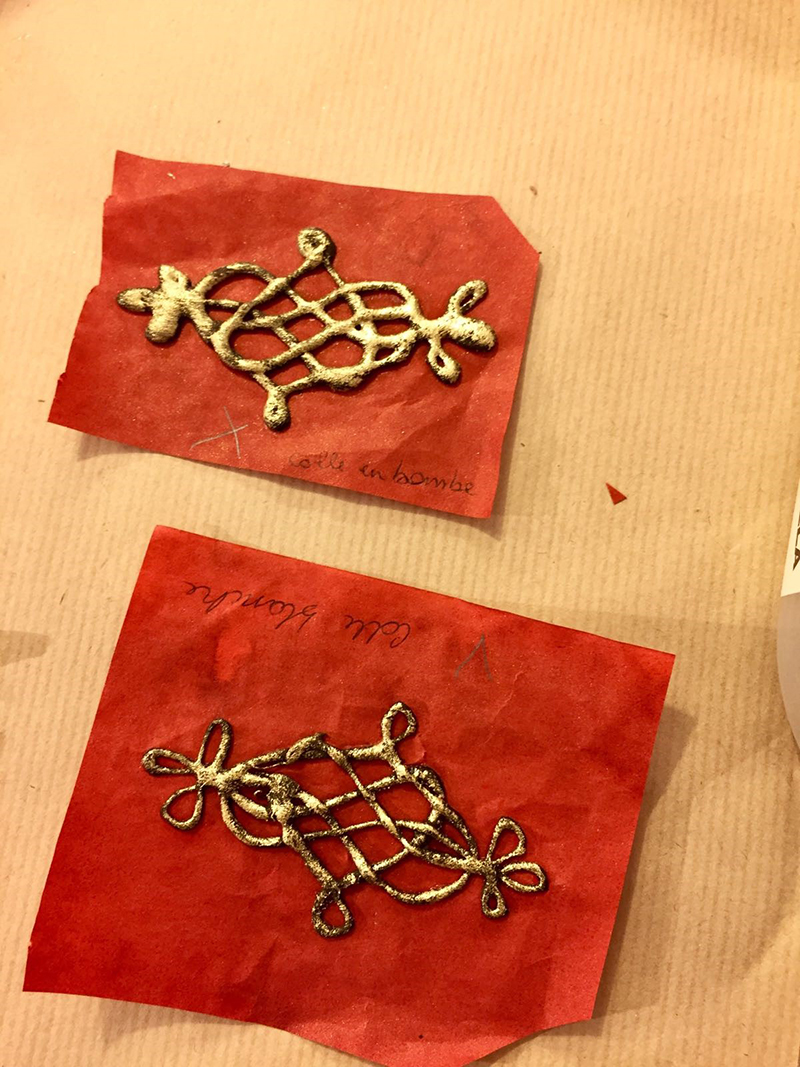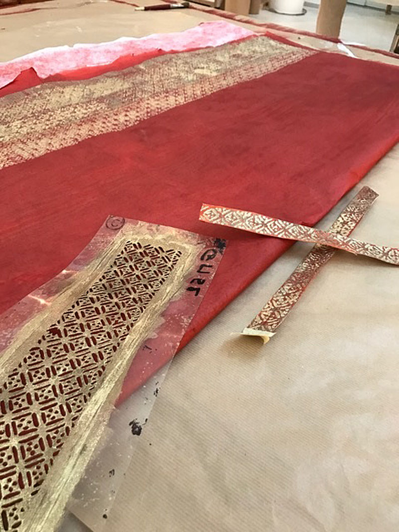 Here strips of gold lace are being created using the stencil at left.