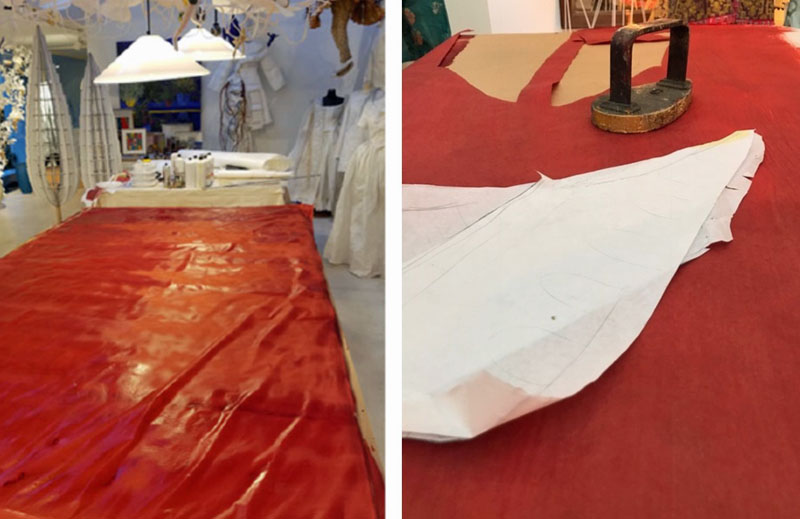 The majority of de Borchgrave’s sculptures of costume are constructed from white paper that has been painted to resemble fabric—here the vivid red of the princess’s silk satin gown. In the image at left, you get a sense of how tricky it would be to carefully handle large quantities of wet paper. De Borchgrave’s studio assistants who visited Pittsburgh told me that one of the trickiest parts of the process is simply painting and drying the paper, since the wet paper is heavy and has a tendency to break and tear. At right, the paper has dried and the sleeve pieces are being cut.