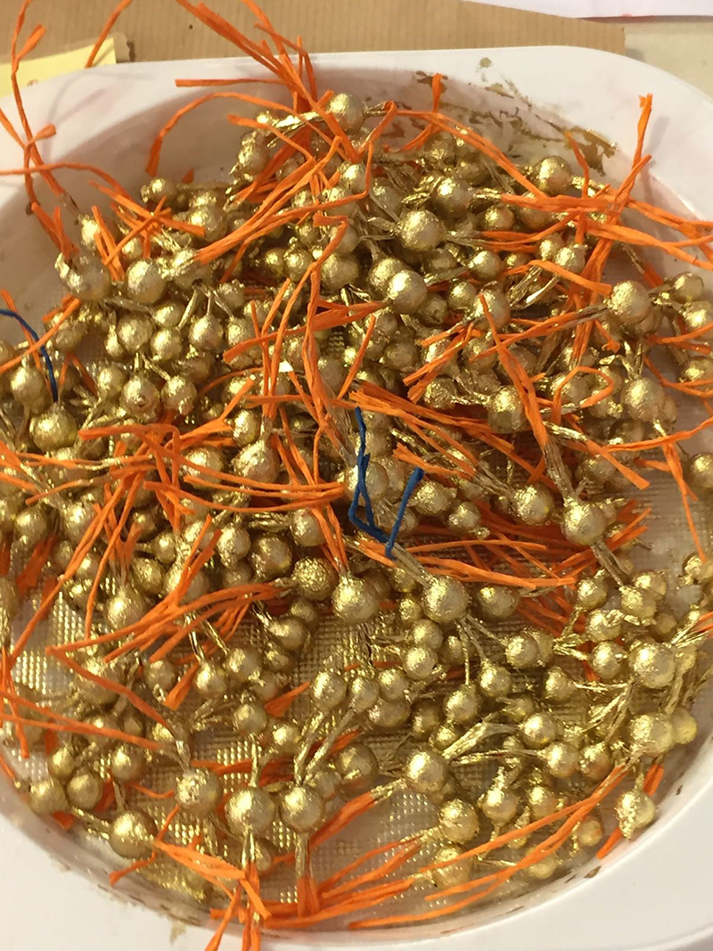 The gown is covered with hundreds of gold beads created from paper.