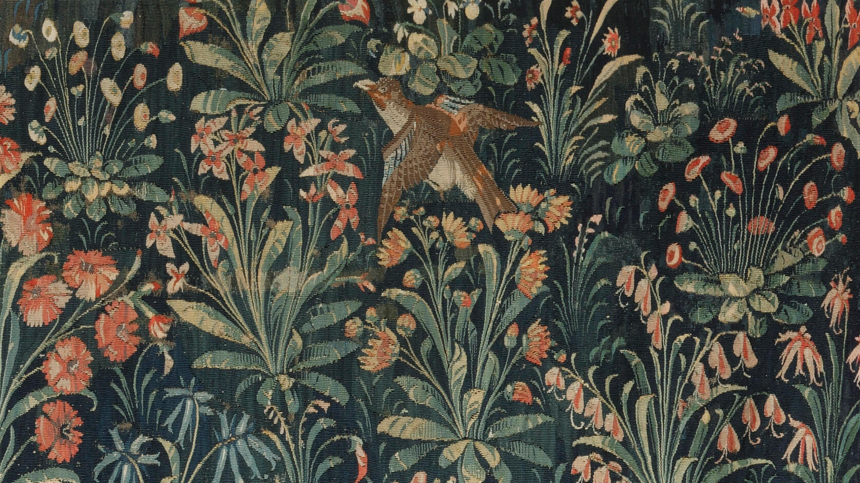 Two Musicians, Tapestry, Millefleurs style, French, School of Loire, early 16th century. Wool and silk threads, 96 x 90 in. Frick Art & Historical Center, Pittsburgh, 1970.53.