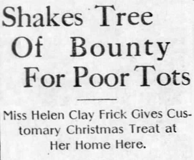 They were received with a cordiality that at once made them feel happy because Santa Claus had appointed the hostess as one of his assistants. Miss Frick was aided by members of the household and every effort possible was made to show the boys and girls the most enjoyable afternoon that ever fell to their lot. In the words of one of the youngsters who enjoyed the feast, “everything was great,” as not a dainty that had ever caught the eye in market, bakery or confectionery shop seemed to be lacking. And, most appetizing of all, there was turkey; so much, in fact, the children considered the feast a success even before various other viands were served…Miss Frick also contributed to the future welfare of her young guests by presenting them with articles of clothing, the distribution being made according to the demands as indicated by the appearance of the little ones.