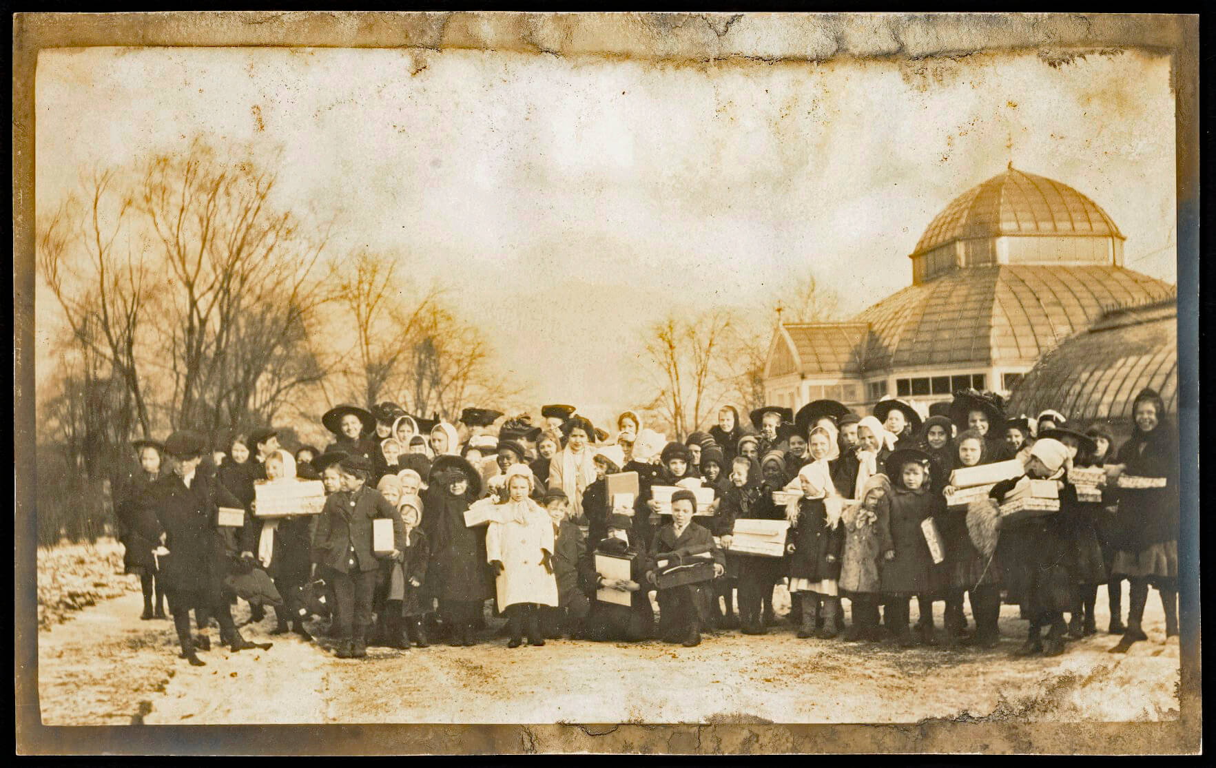 An undated photograph from one of Helen’s scrapbooks reveals a group of children of various ages and races, accompanied by female chaperones, all holding wrapped boxes while posing on the snow-covered path beside Clayton’s Playhouse and Conservatory.