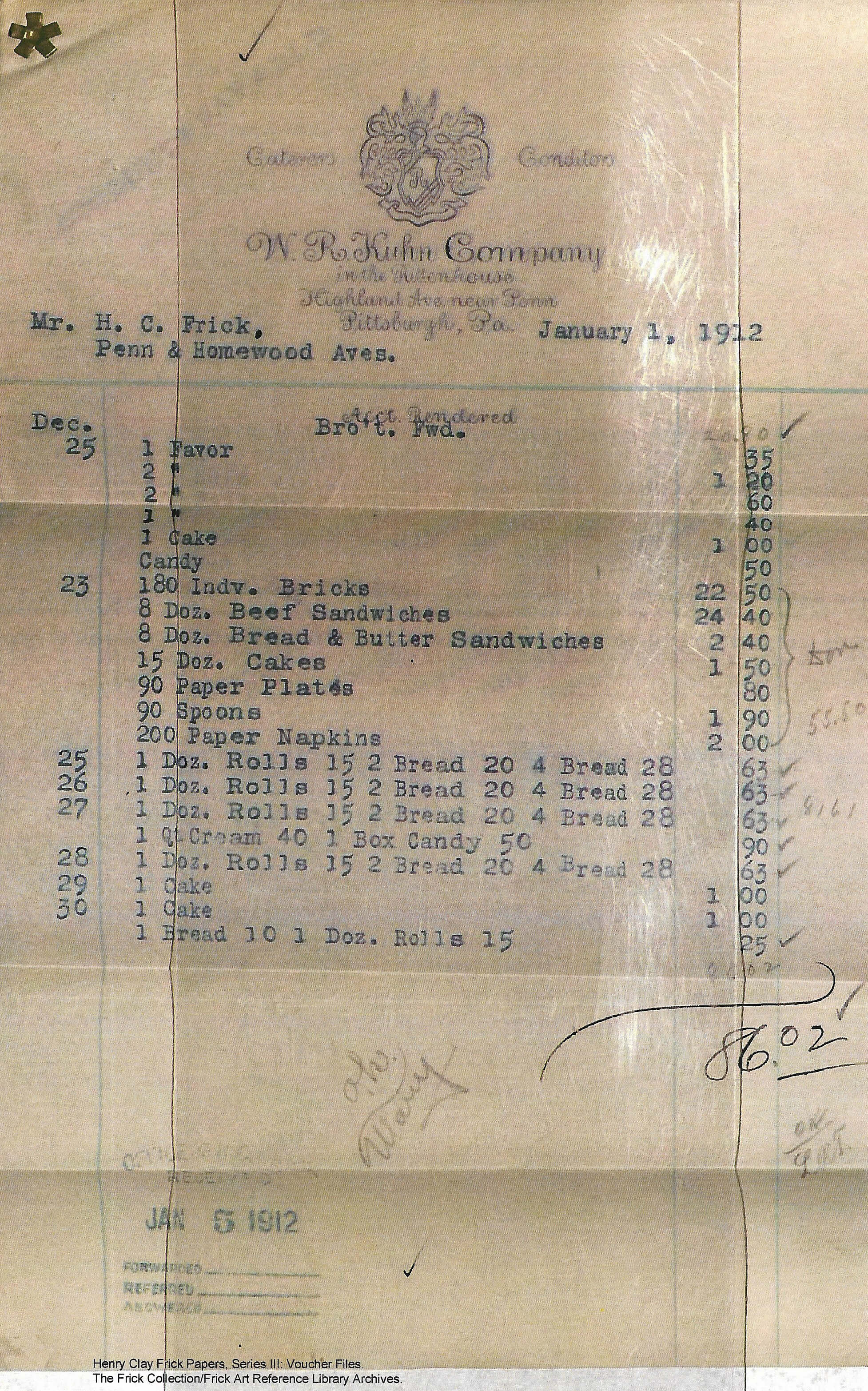 Receipt for catering from W.R. Kuhn Company for Helen Clay Frick’s 1911 Christmas party.