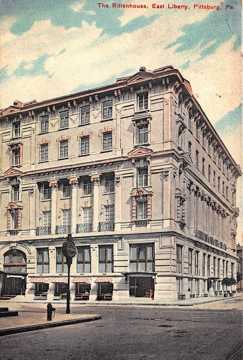 Postcard image, circa 1910, of Pittsburgh's Rittenhouse Hotel. Built in 1908 by William R. Kuhn Rittenhouse at North Highland and Kirkland, it was the scene of many society events. The building was demolished in the 1960s during East Liberty's urban redevelopment.