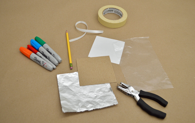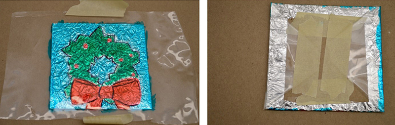 Place the cellophane with your picture over the cardboard wrapped in foil. Line up the edges of the drawing with the edges of the cardboard. Next, flip everything over and tape down the cellophane, like you are wrapping a present.