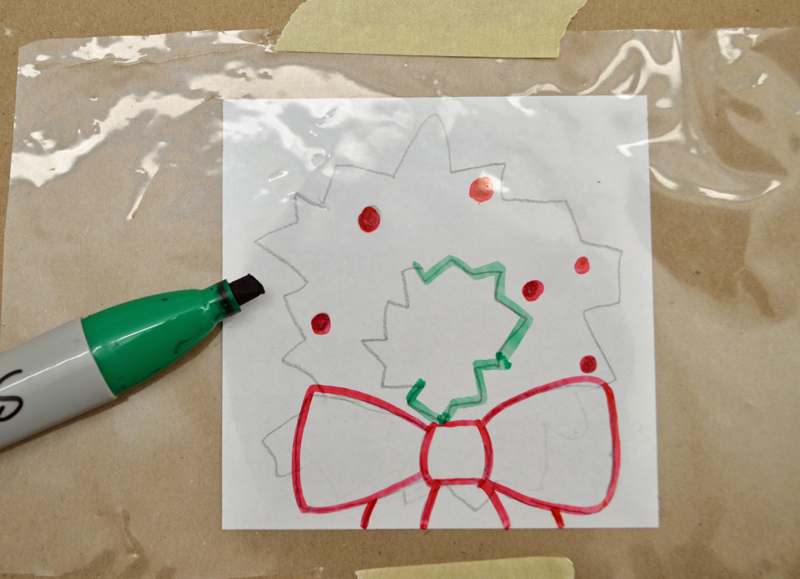 Lay the cellophane over the white paper. Tape the cellophane down so it doesn’t move. Then, using permanent markers, trace your image onto the cellophane. The more color you use the more interesting your final project will be. Don’t be afraid to fill in all the space.