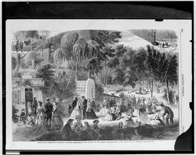 As Decoration Day grew and evolved in the north, their southern counterparts remained quiet, somber events, as participants honored not only their fallen soldiers, but mourned the defeat of the Confederate cause itself. There were no parades, likely little music. Throughout the spring, southerners gathered in their cemeteries to pull weeds, repair tombstones, and decorate Confederate graves with flowers. These springtime events were particularly popular in Richmond, the former capital of the Confederacy. The most prominent Decoration Days were held in Hollywood Cemetery, the largest in the city, and the resting place of several Confederate military heroes. Following Logan’s general order creating Memorial Day, southerners moved quickly to distinguish themselves from the north by creating Confederate Memorial Day, which took place on different dates throughout the states of the former Confederacy.