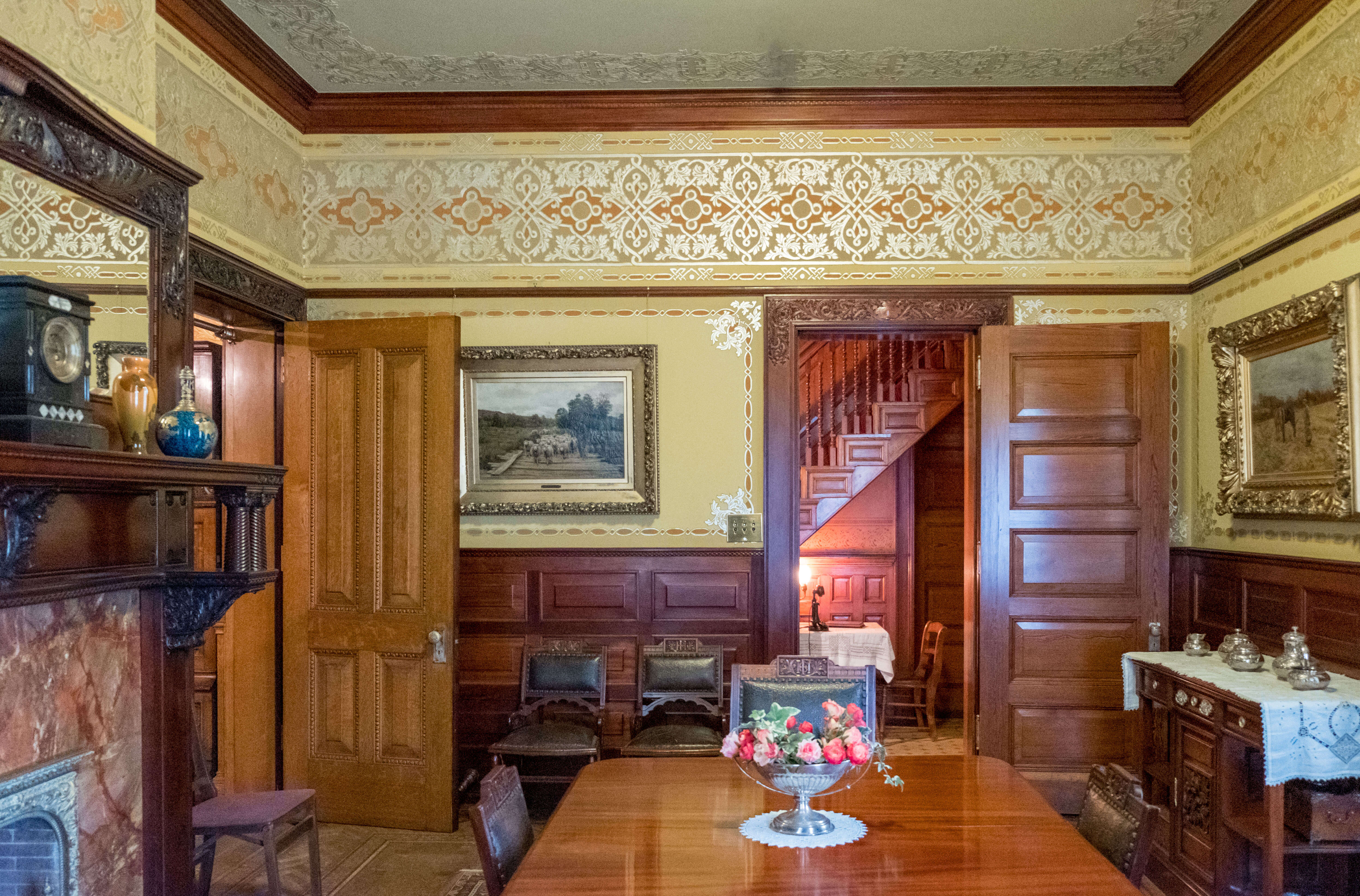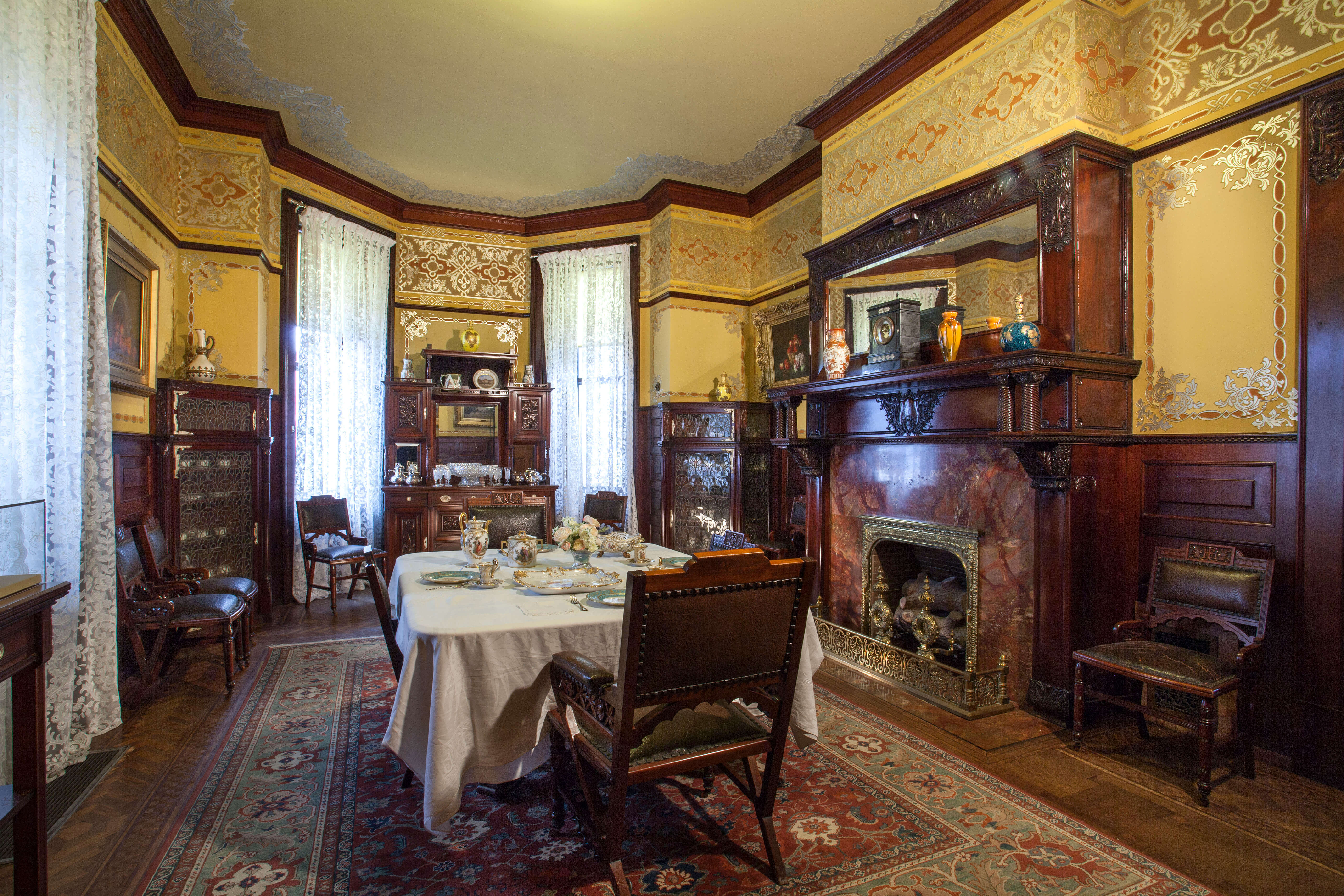 Frick was likely well aware of the innovative material through his business network. Two of his closest friends were the Mellon brothers, Andrew W. and Richard Beatty, who made significant early investments in the aluminum industry in Pittsburgh. The Mellon brothers were frequent guests at Frick’s weekly after-dinner gatherings in the breakfast room at Clayton where the aluminum decoration served as a backdrop while they smoked cigars and played poker. See the decoration up close and learn more about life and technology in the Gilded Age on a guided tour of Clayton.