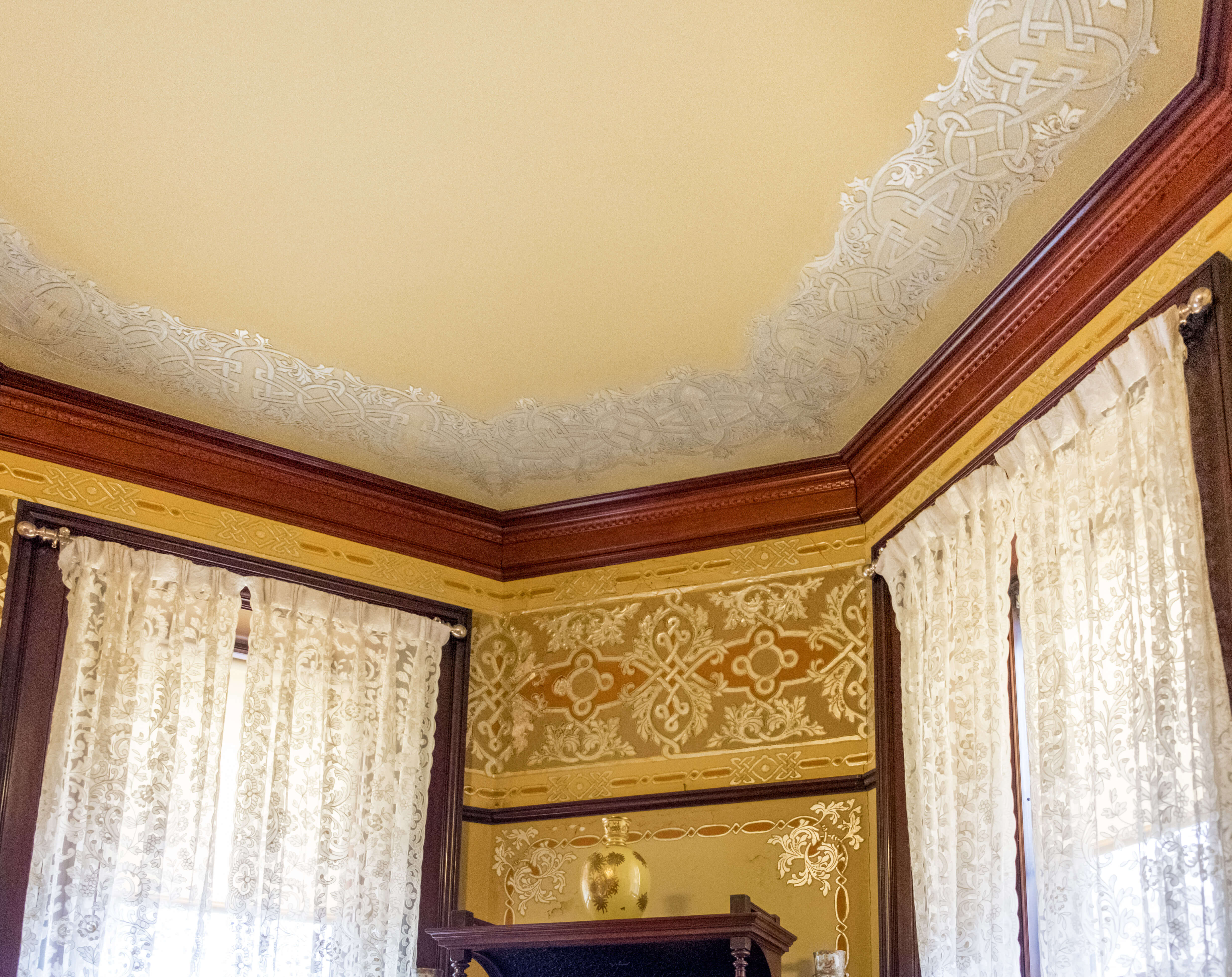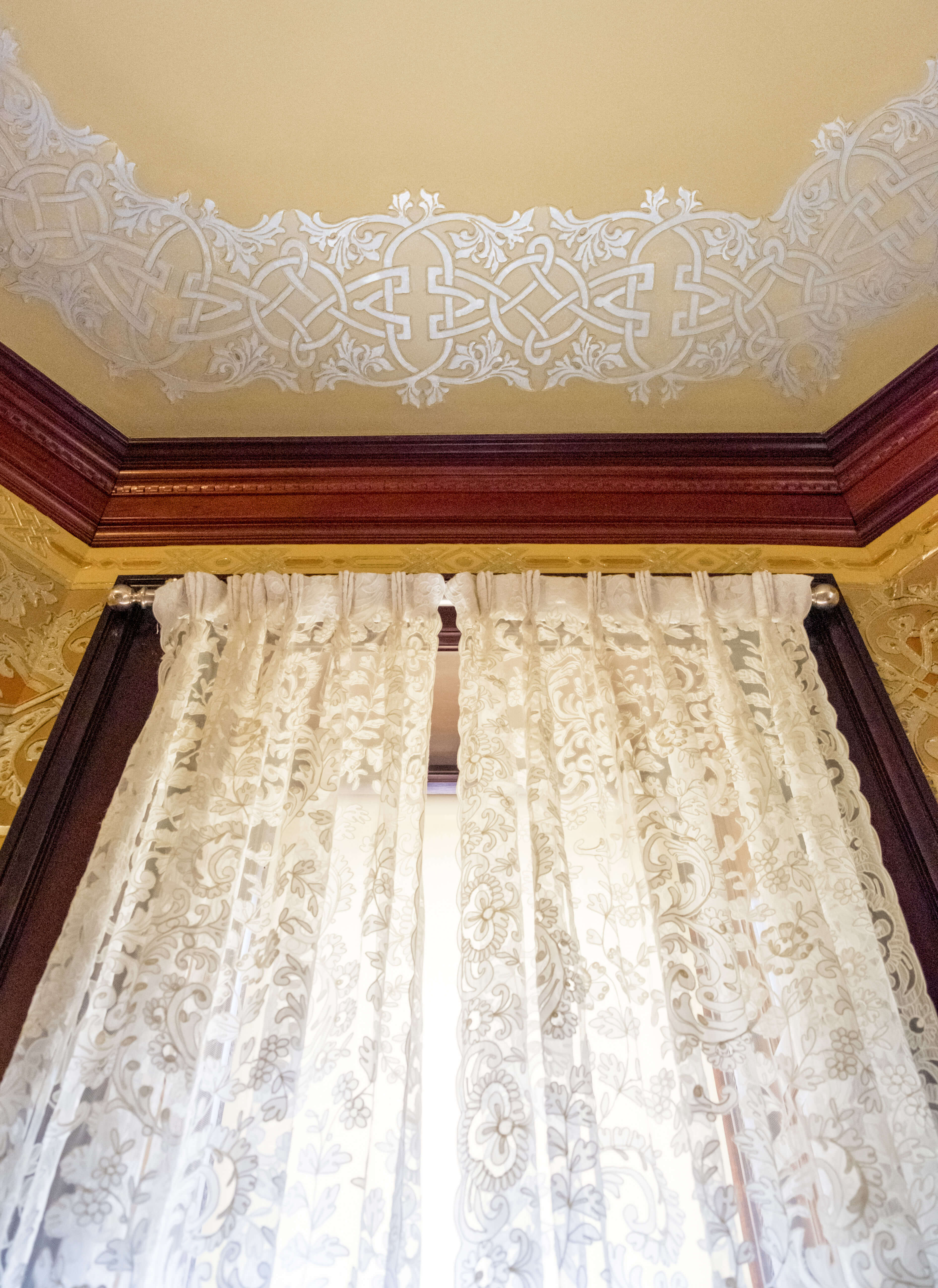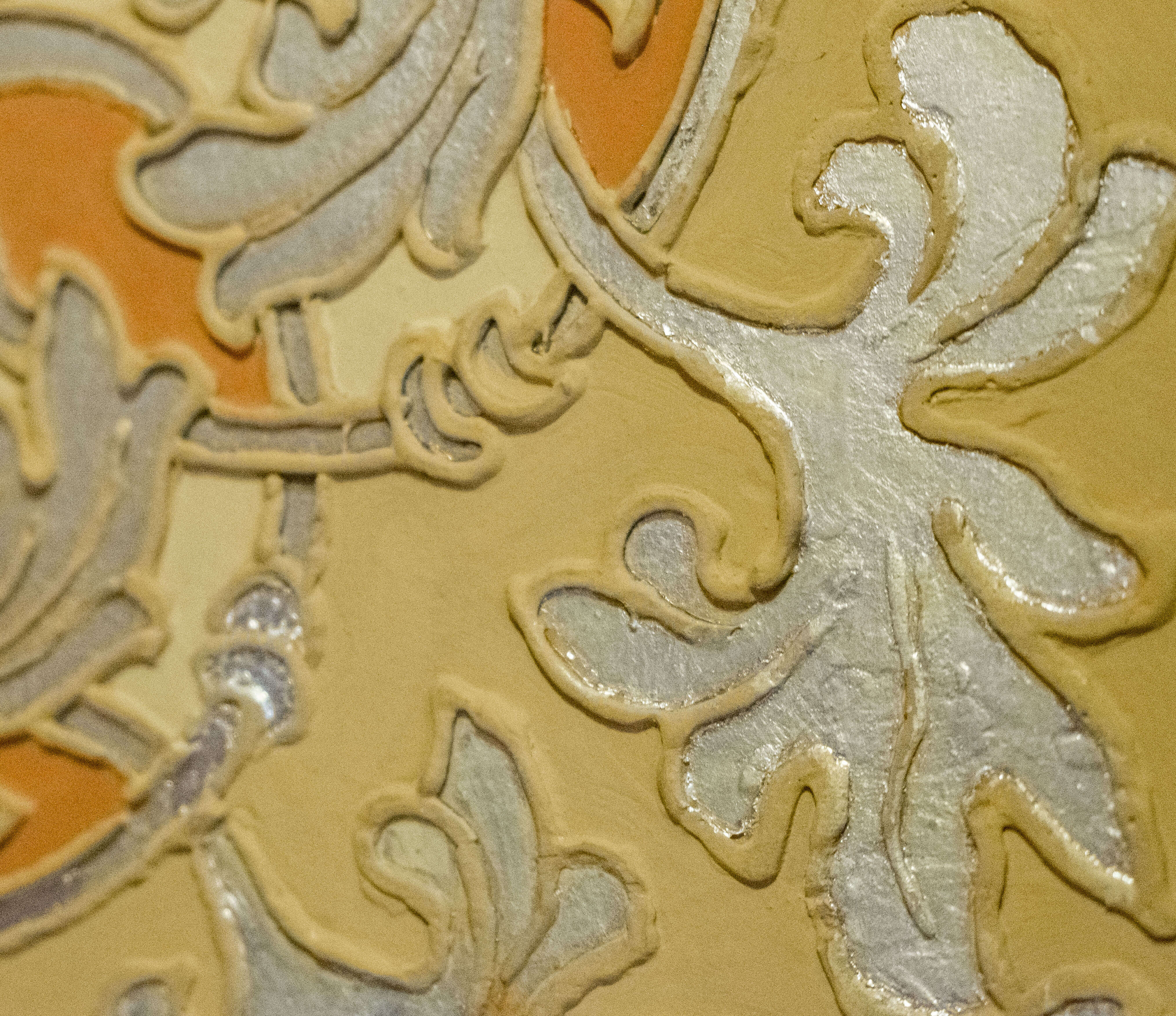 Intertwined bands wind across the surface of the walls and ceiling of the breakfast room in geometric compositions embellished with scrolling acanthus leaves. The raised plaster surface is piped on, similar to cake icing, while aluminum leaf fills the voids. The ornamental strapwork and foliage borrows freely from Byzantine and Renaissance style sources and relates to motifs seen throughout the home, but the historicist appearance belies the novel material it showcases.
