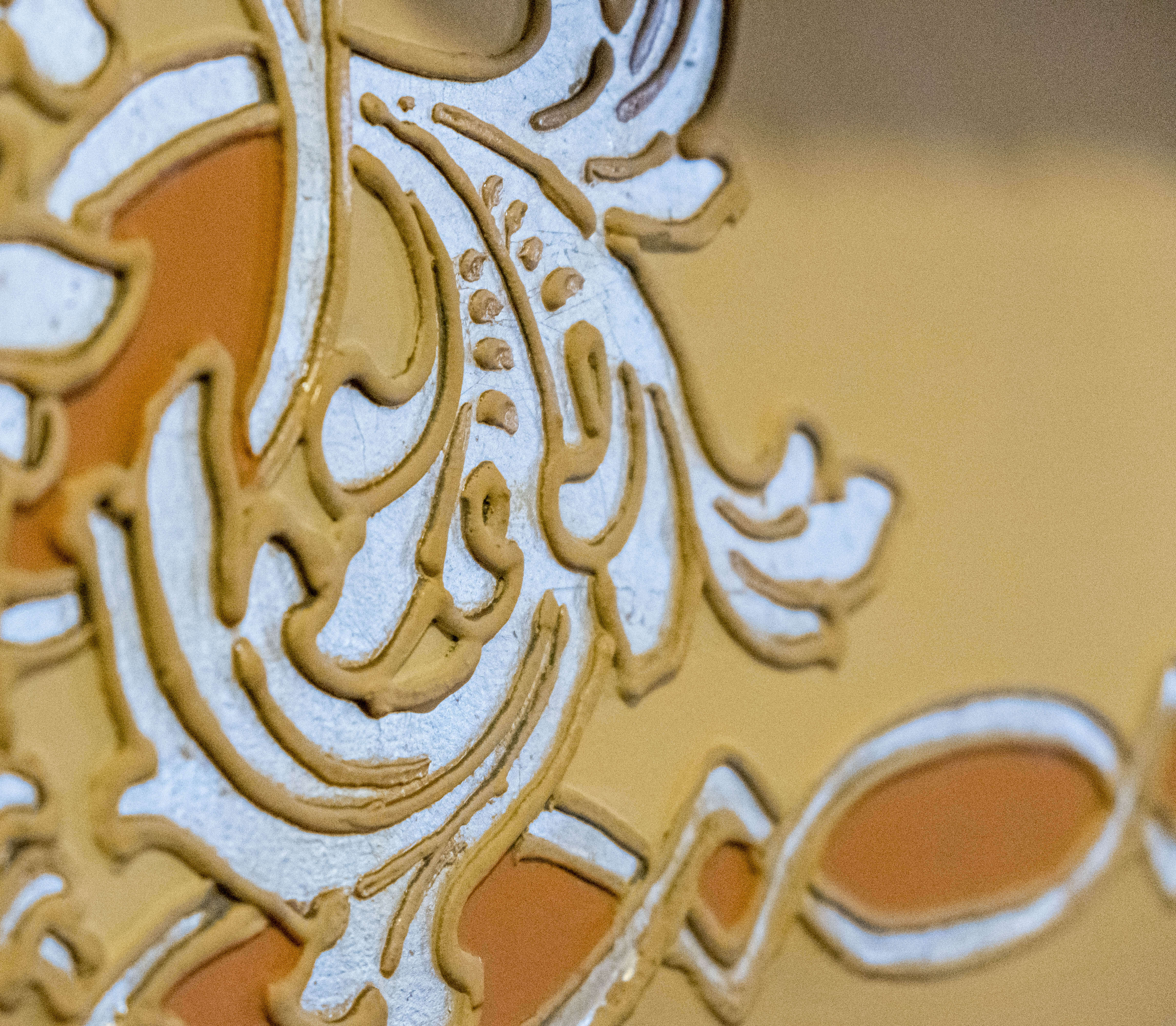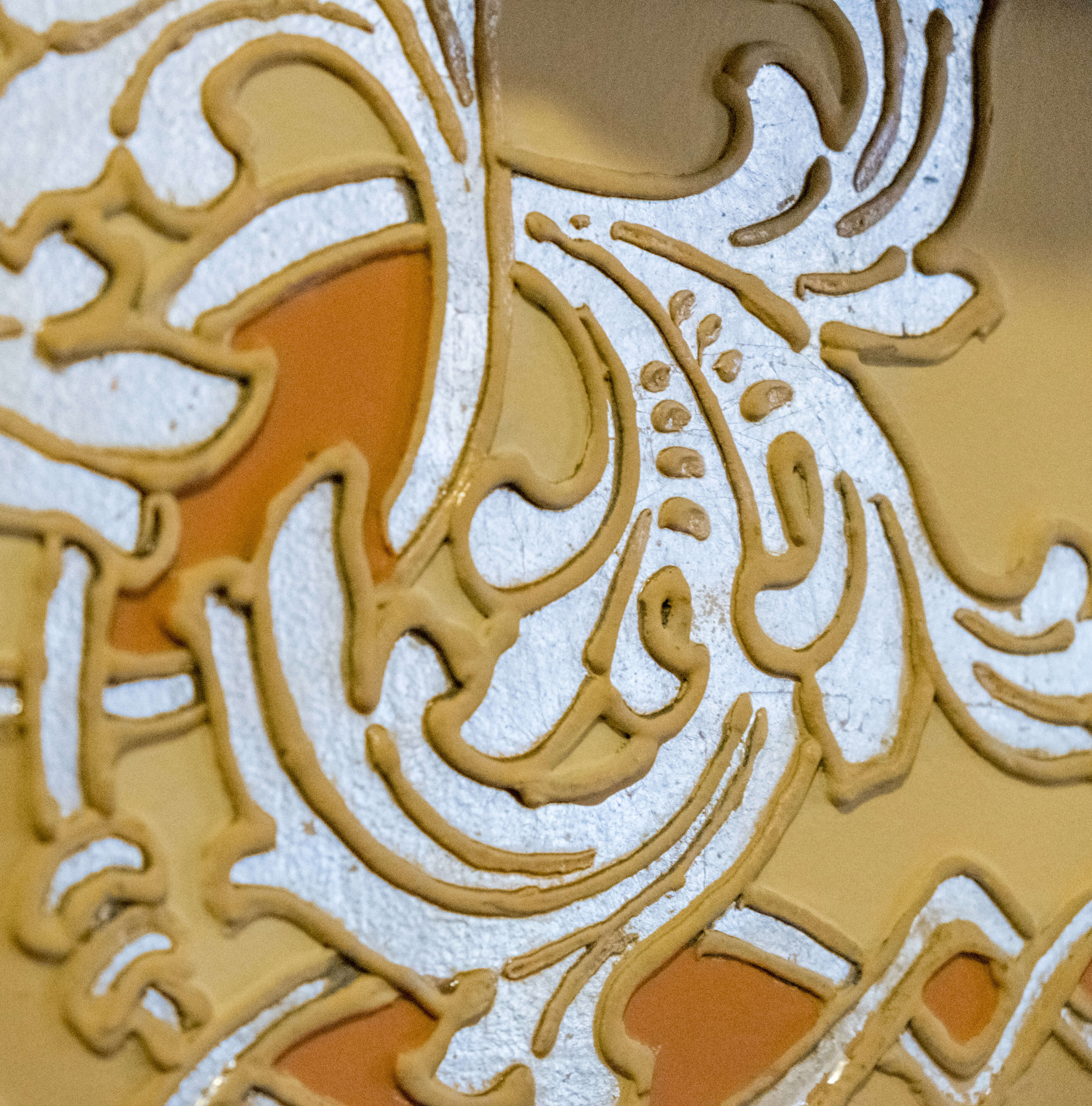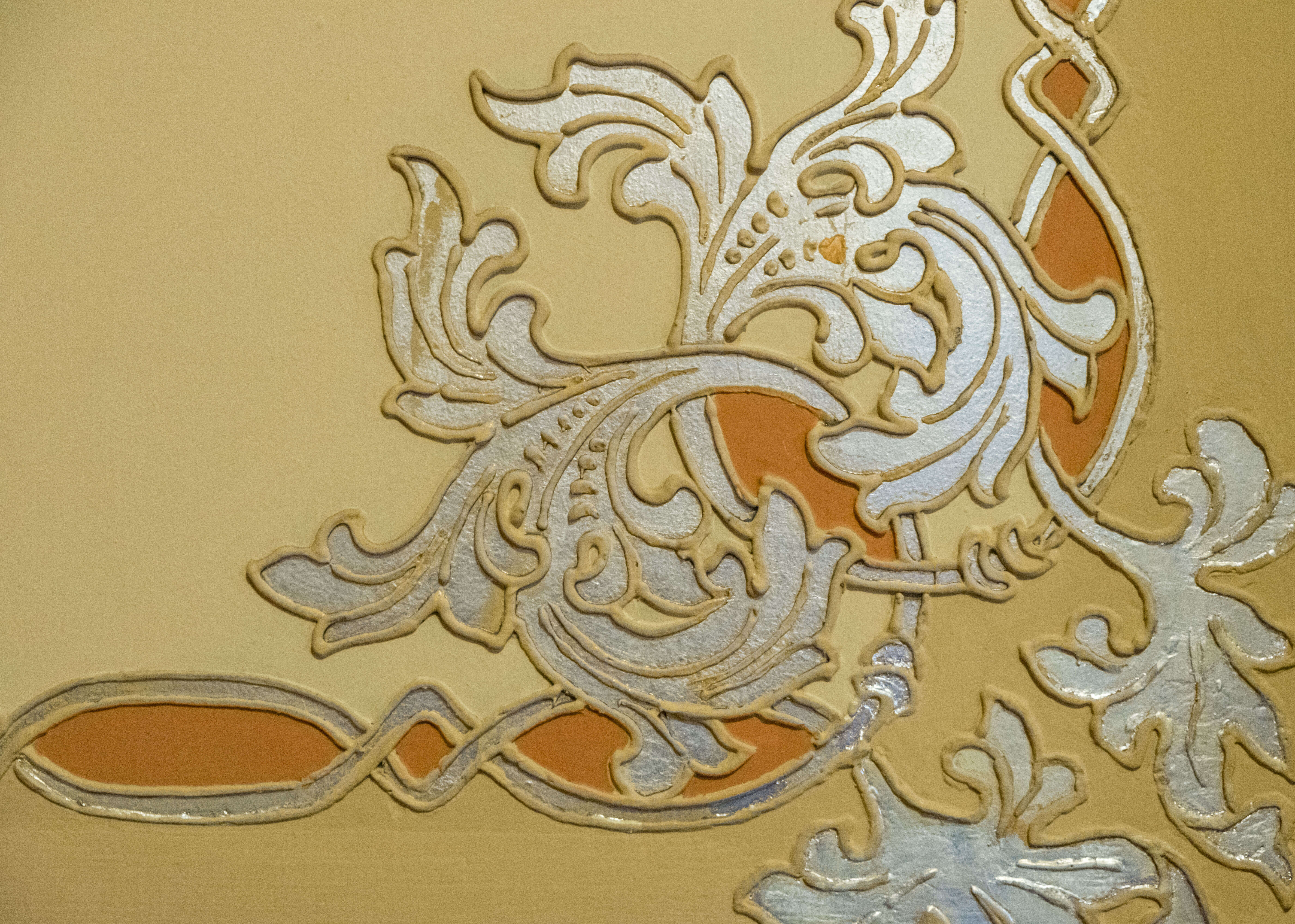 Intertwined bands wind across the surface of the walls and ceiling of the breakfast room in geometric compositions embellished with scrolling acanthus leaves. The raised plaster surface is piped on, similar to cake icing, while aluminum leaf fills the voids. The ornamental strapwork and foliage borrows freely from Byzantine and Renaissance style sources and relates to motifs seen throughout the home, but the historicist appearance belies the novel material it showcases.