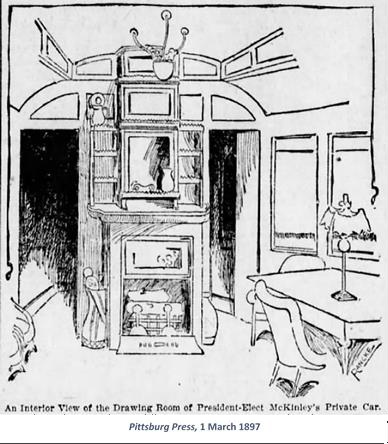 The McKinley entourage also travelled by rail, leaving Canton, Ohio for Washington, D.C. via Pittsburgh. The McKinleys occupied a private train car that exceeded the Haslemere for “chief luxury of the interior.” The car was paneled in solid white oak and featured an “old-fashioned” log fireplace and two “palatial“ bedroom apartments with private baths. It was described in the inaugural program as a “huge safety box” because of the security provided by its double steel framework, cushioned ceiling, and four thicknesses of white oak flooring. Pittsburgh turned out in the late evening of March 1, 1897 to catch a glimpse of the president-elect in this luxurious car known only as No. 38. The train pulled into Pittsburgh’s Union Station at 11:30 PM, passing thousands who had thronged the route even at that late hour, hoping to witness McKinley stepping out of his “safety box” to greet the admiring crowd. “They wanted to see McKinley. Everything was McKinley,” explained the Pittsburgh Press. “The cry was McKinley, McKinley! Long Live and Good Luck to McKinley!”