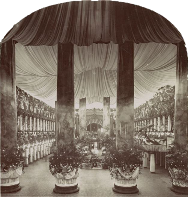 Pension Building’s Grand Hall decorated for 1897 McKinley inauguration.
