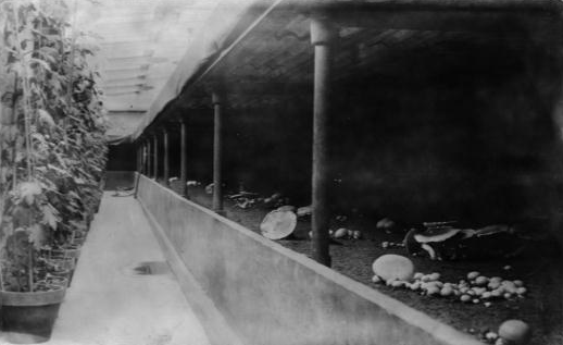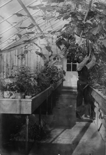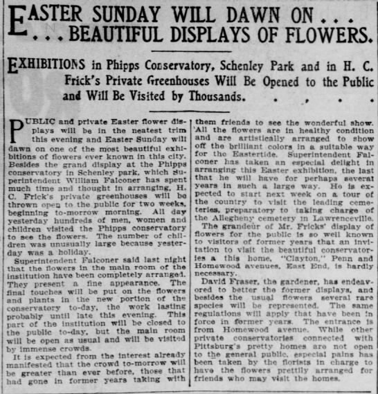 Fraser followed up the next spring with an Easter show of Bermuda lilies and orchids. During these shows the greenhouse would remain open for several weeks. Guests would enter from the Homewood Avenue gates and walk past cultivated rose gardens. Fraser also had a national reputation for his expertise in mushroom cultivation at the Frick greenhouse.