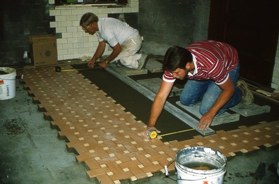 Workers laying new tile in kitchen at Clayton, c. 1989.