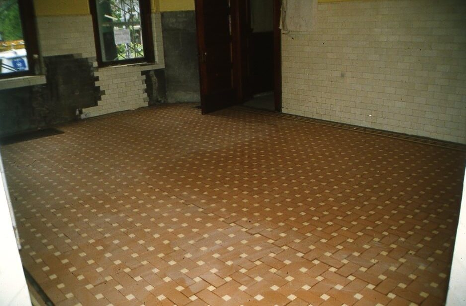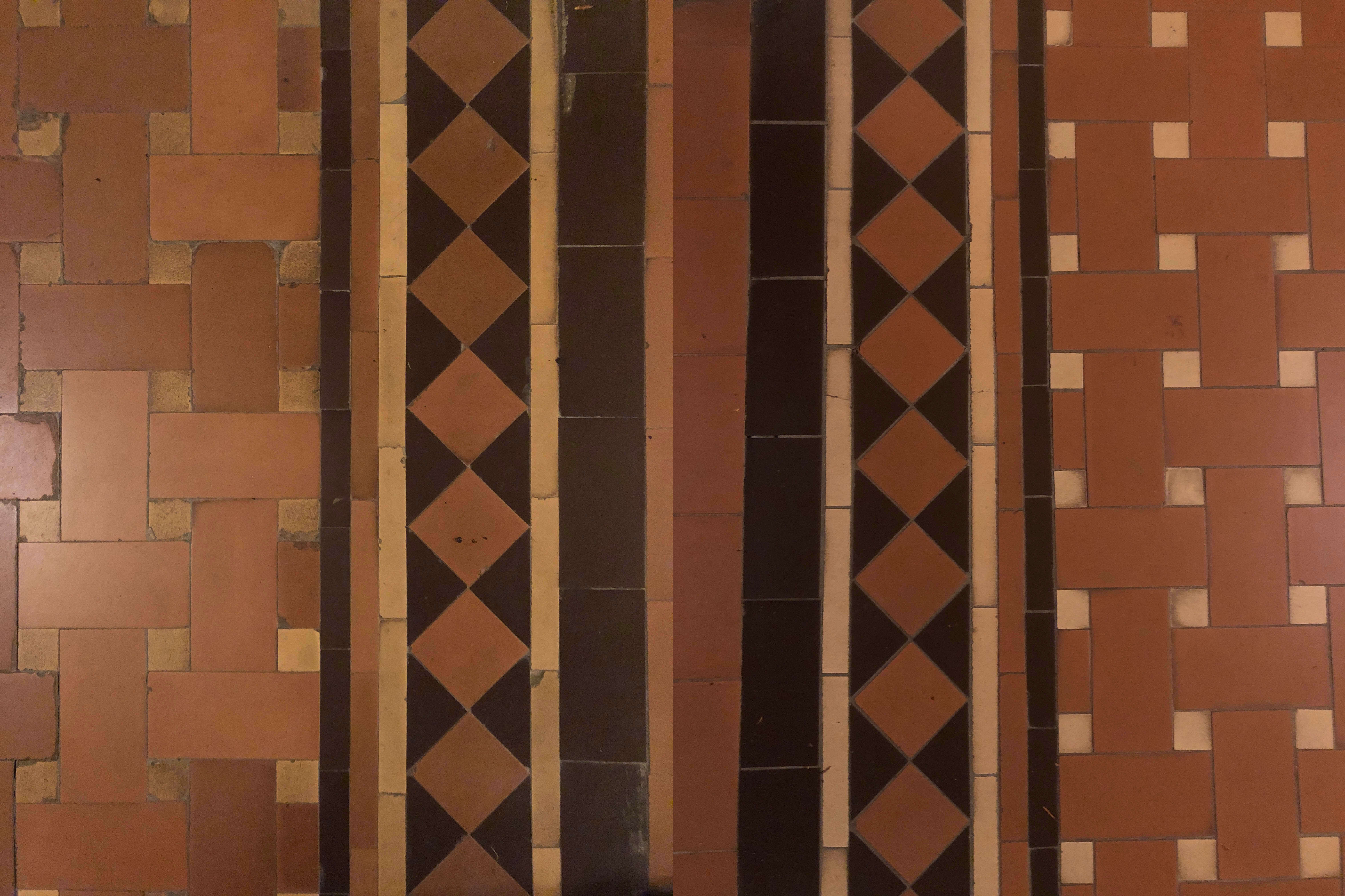 Left: Original encaustic tile in butler’s pantry. Right: Reproduction tile in kitchen.