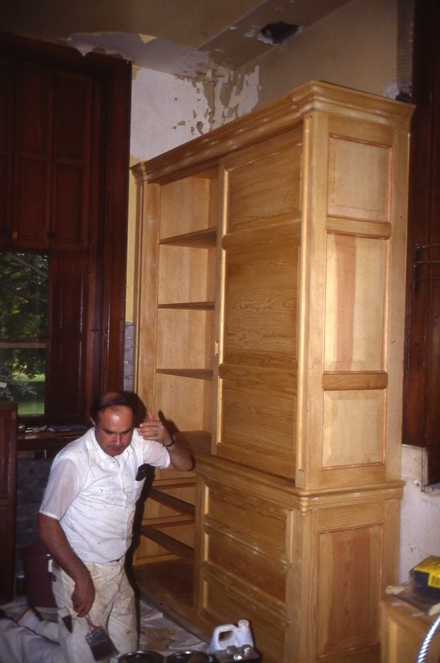 Cabinetmaker constructing new cabinets in scullery, c. 1989.