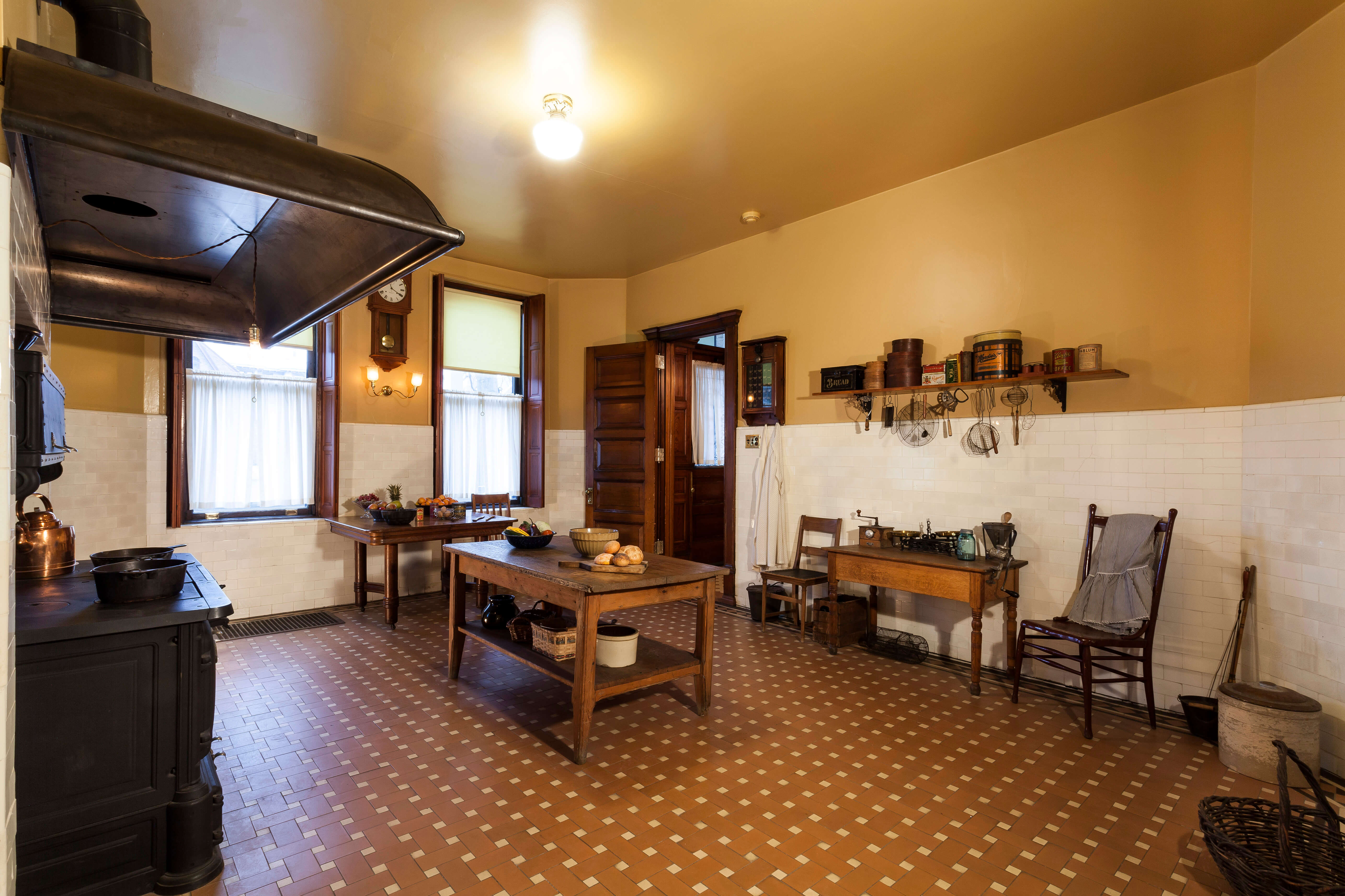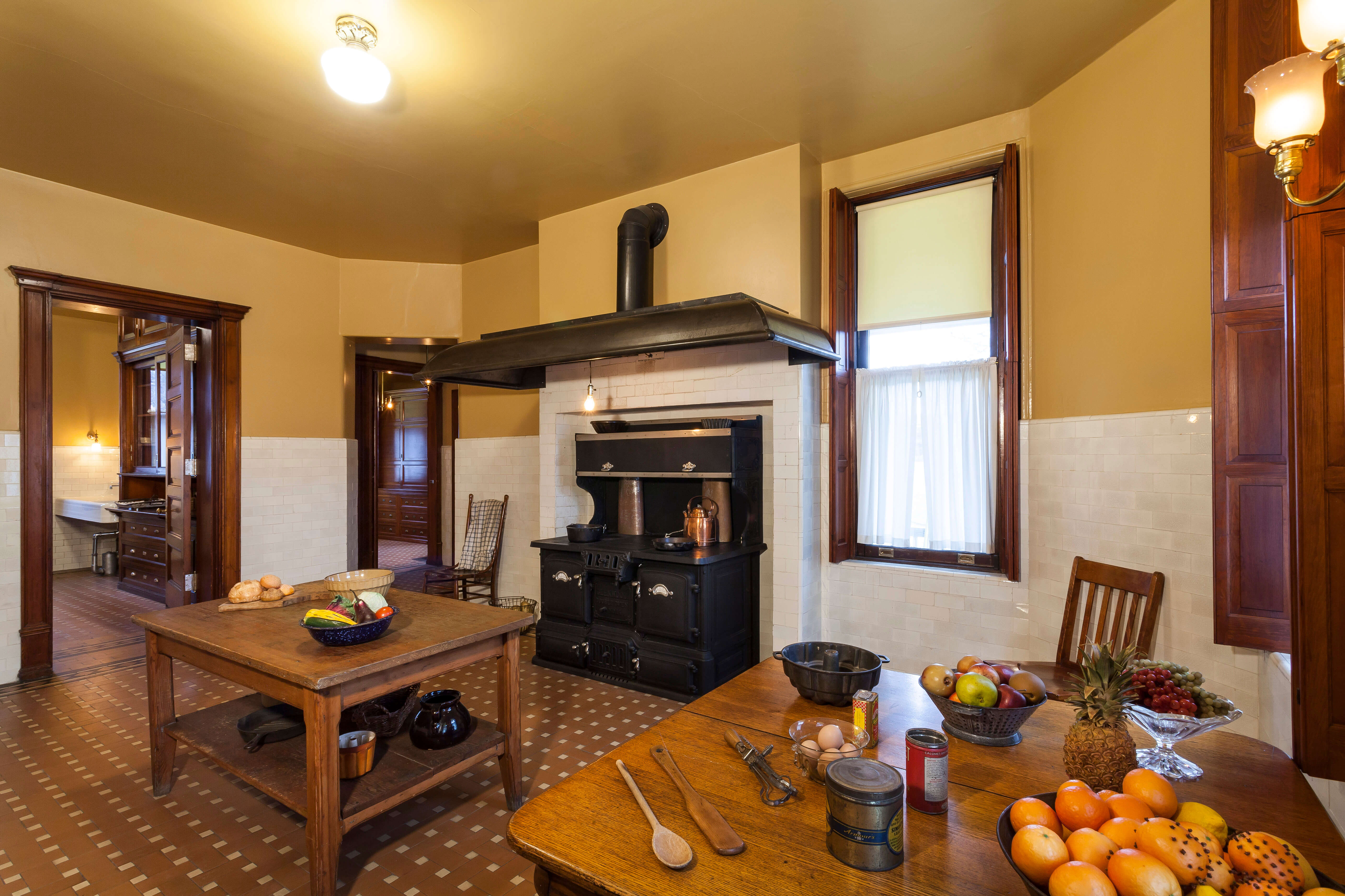 Contractors framed new walls to recreate the cold storage room and also constructed cabinets to match the originals and restore the appearance of the scullery. In order to use as much original material as possible, workers moved white tiles from the unrestored third and fourth floor bathrooms to rebuild the stove alcove and repair damaged and missing sections of the tiled walls. Painters applied a fresh coat to the canvas wall coverings, recreating the original golden mustard color discovered during paint analysis.