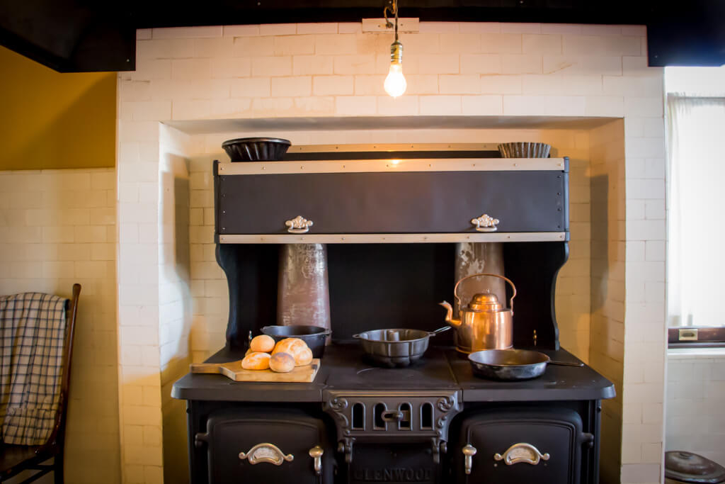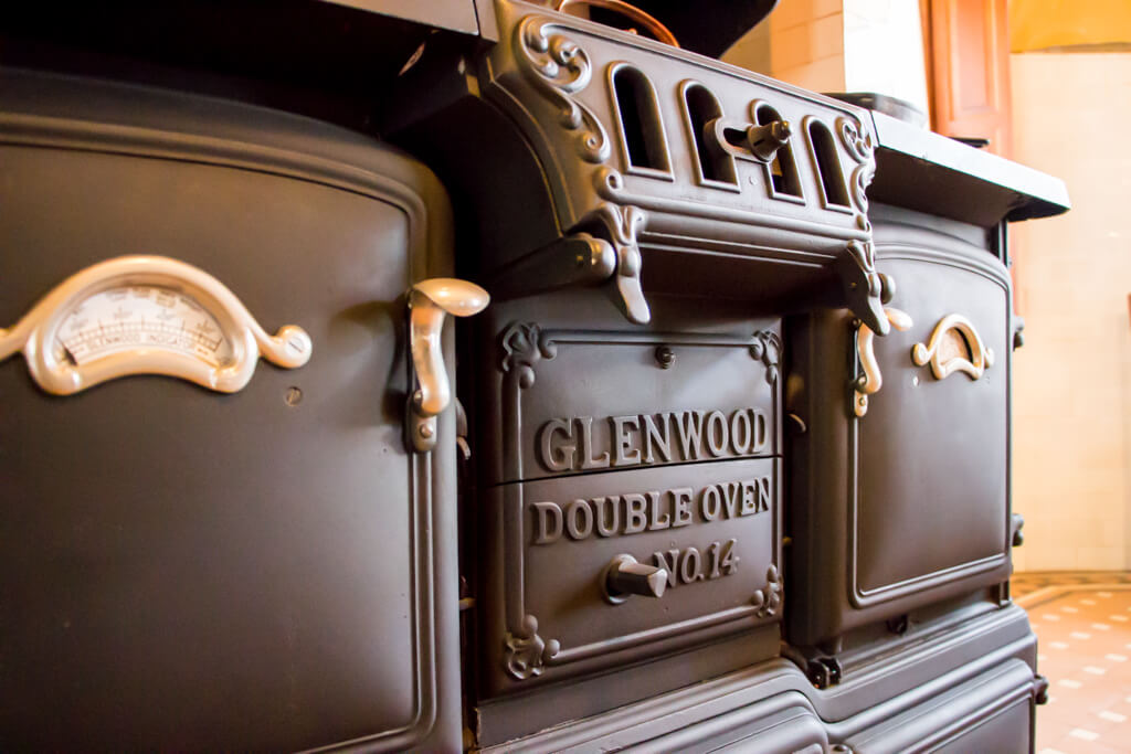 Although much of the original porcelain, crystal, and silverware remain at Clayton (much of it on view in the butler’s pantry as it was for more than one hundred years), very few artifacts from the kitchen itself survive. Curators recreated the setting by purchasing furnishings and accessories from local antique stores. Crockery, pots, cookware, and kitchen gadgets were relatively easy to find but one fixture proved more difficult.Curators sought an appropriate replacement for the original stove at Clayton. Research revealed that the stove next to Spencer Ford in the photograph was a Jewett steel range. No extant examples could be found, but curators did locate a remarkably similar antique cast iron cook stove in excellent condition. The Glenwood Double Oven No. 14 was a high-end model produced by Weir Stove Company in the late nineteenth century. With six burners, two ovens, a broiler, and warming compartments, the Glenwood was a technologically advanced range for the professional cook and a well-suited replacement for Clayton’s kitchen.