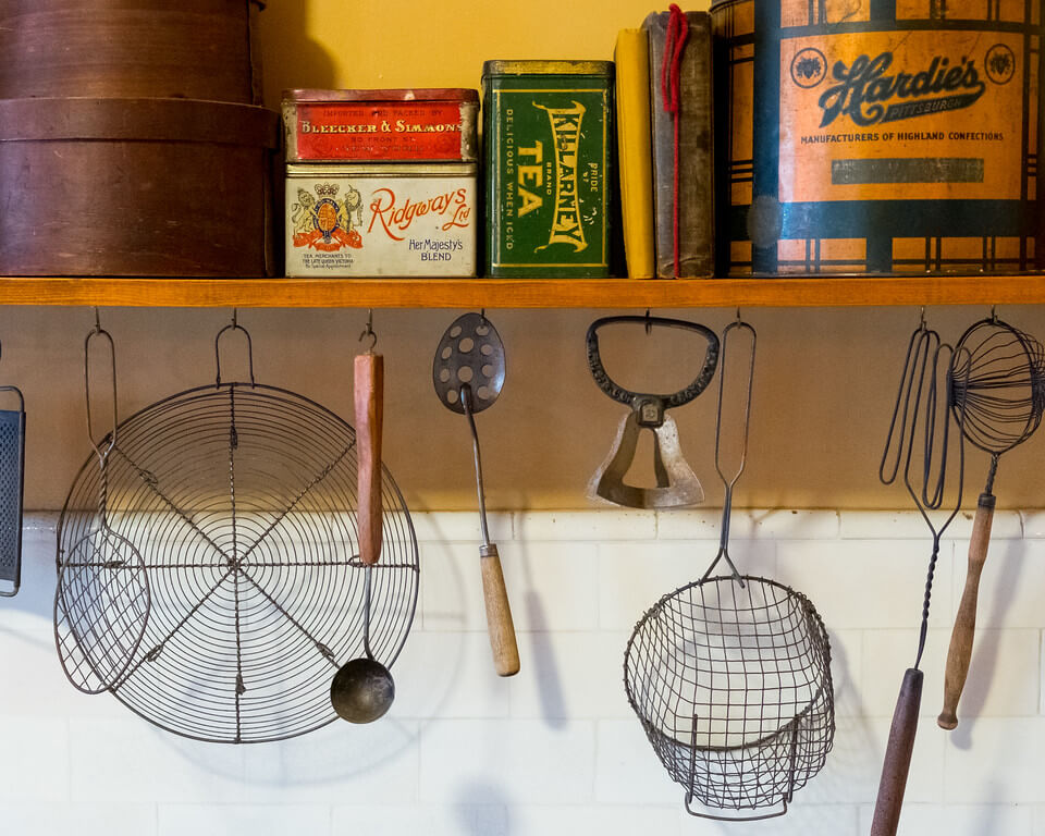 Archival evidence revealed that Clayton had a gas-fueled boiler in the basement to supply hot water. The gas-fired range was simpler to use and maintain than earlier coal-fired stoves. And that cold storage room? It was basically a zinc-lined walk-in refrigerator chilled by big blocks of ice. Many of these features, however, had disappeared completely from Clayton’s kitchen by the 1980s. In order to give visitors a sense of the modern Victorian kitchen, restoration staff had a huge task ahead of them.