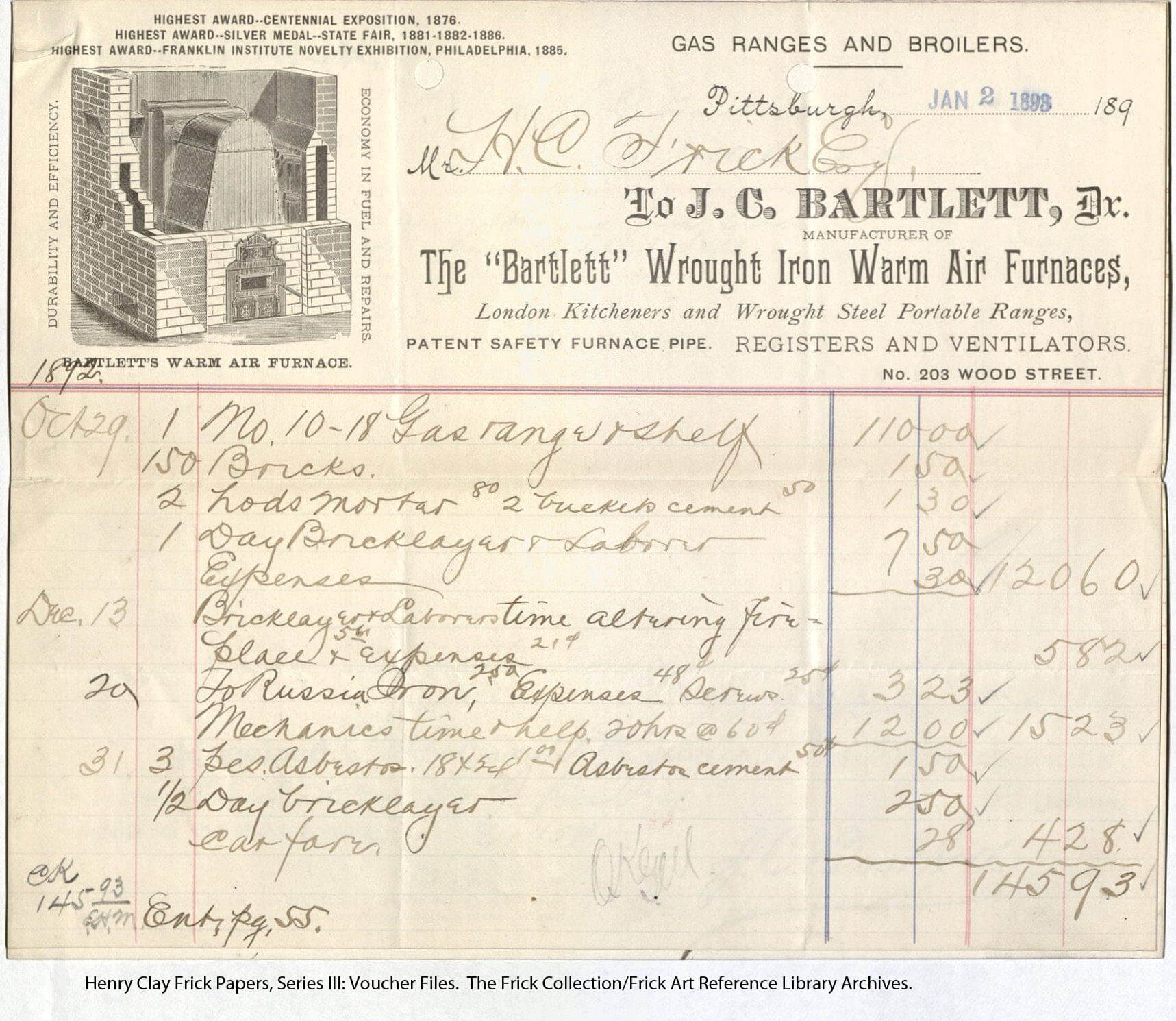 Receipt listing gas range purchased for Clayton from J.C. Bartlett, January 2, 1893. Courtesy of The Frick Collection/Frick Art Reference Library Archives.