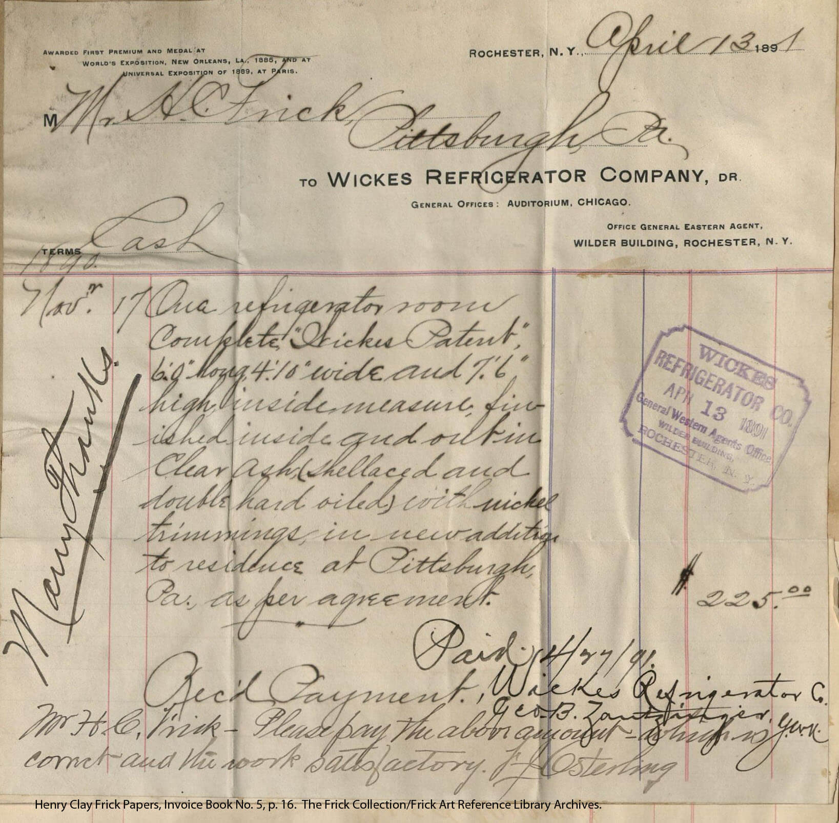 Receipt for “one refrigerator room” purchased for Clayton from Wickes Refrigerator Company, April 13, 1891. Courtesy of The Frick Collection/Frick Art Reference Library Archives.