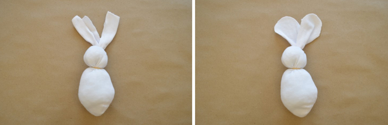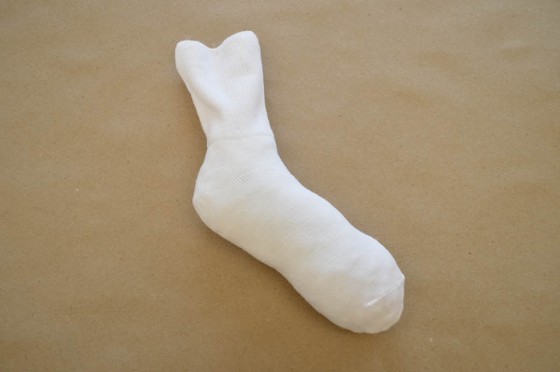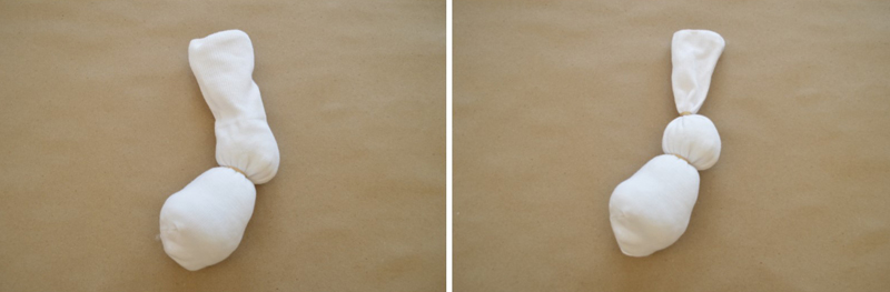 To create the bunny’s body, place the first rubber band where the arch of the sock and the heel meet. Wrap the second rubber band at the bottom of the ankle to create the bunny’s head.