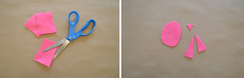 Cut the colored felt into whatever shape you want the tummy to be, plus a small rectangle for the nose, and one or two large triangles for the ears.